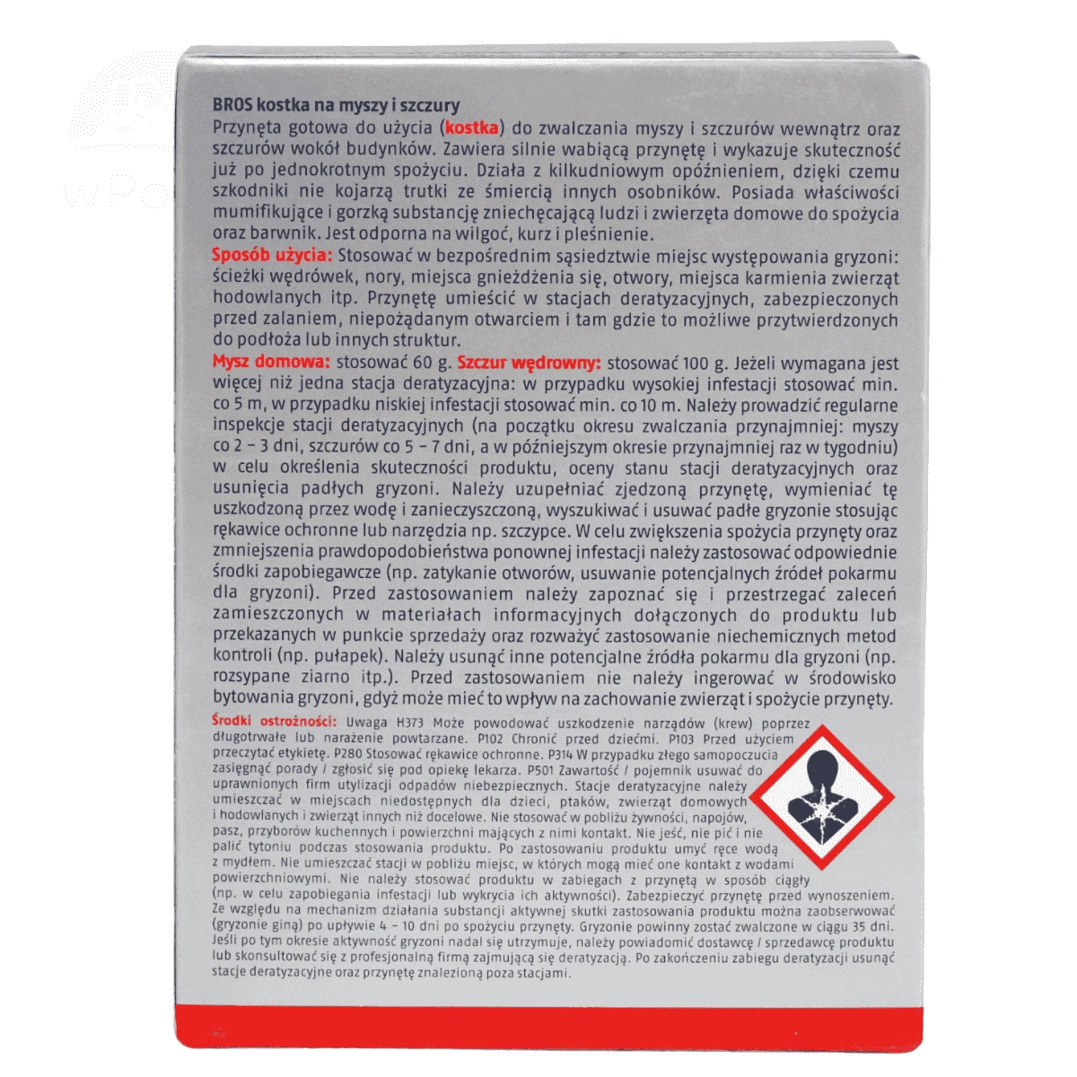Kostka Bros na myszy i szczury to niezawodne rozwiązanie do skutecznego zwalczania gryzoni, zarówno wewnątrz budynków, jak i na zewnątrz, zapewniające długotrwałą ochronę przed szkodnikami.