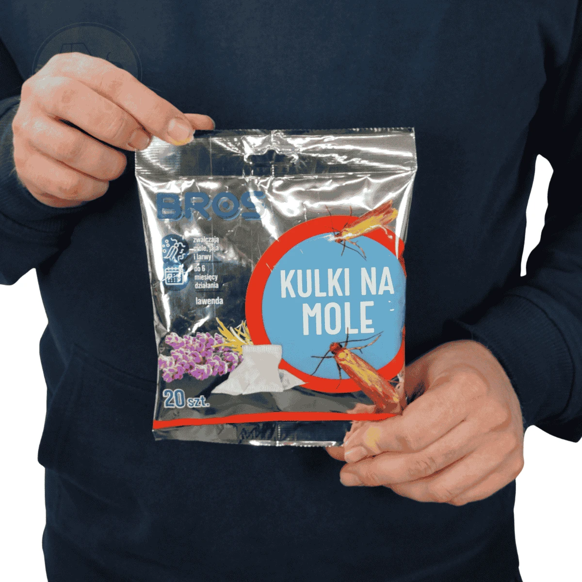 Kulki na mole Bros stanowią sprawdzony sposób ochrony odzieży, tkanin oraz futer przed molami odzieżowymi. Produkt działa kompleksowo – eliminuje dorosłe owady, a także ich jaja i larwy, zapewniając bezpieczeństwo przechowywanej garderoby nawet przez 6 miesięcy. Skuteczność widoczna jest już po 48 godzinach od umieszczenia kulek w szafie lub szufladzie. Każda porcja preparatu znajduje się w osobnej, perforowanej saszetce, co ułatwia stosowanie i zapobiega bezpośredniemu kontaktowi z substancją czynną.