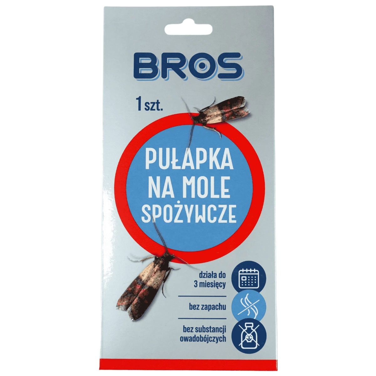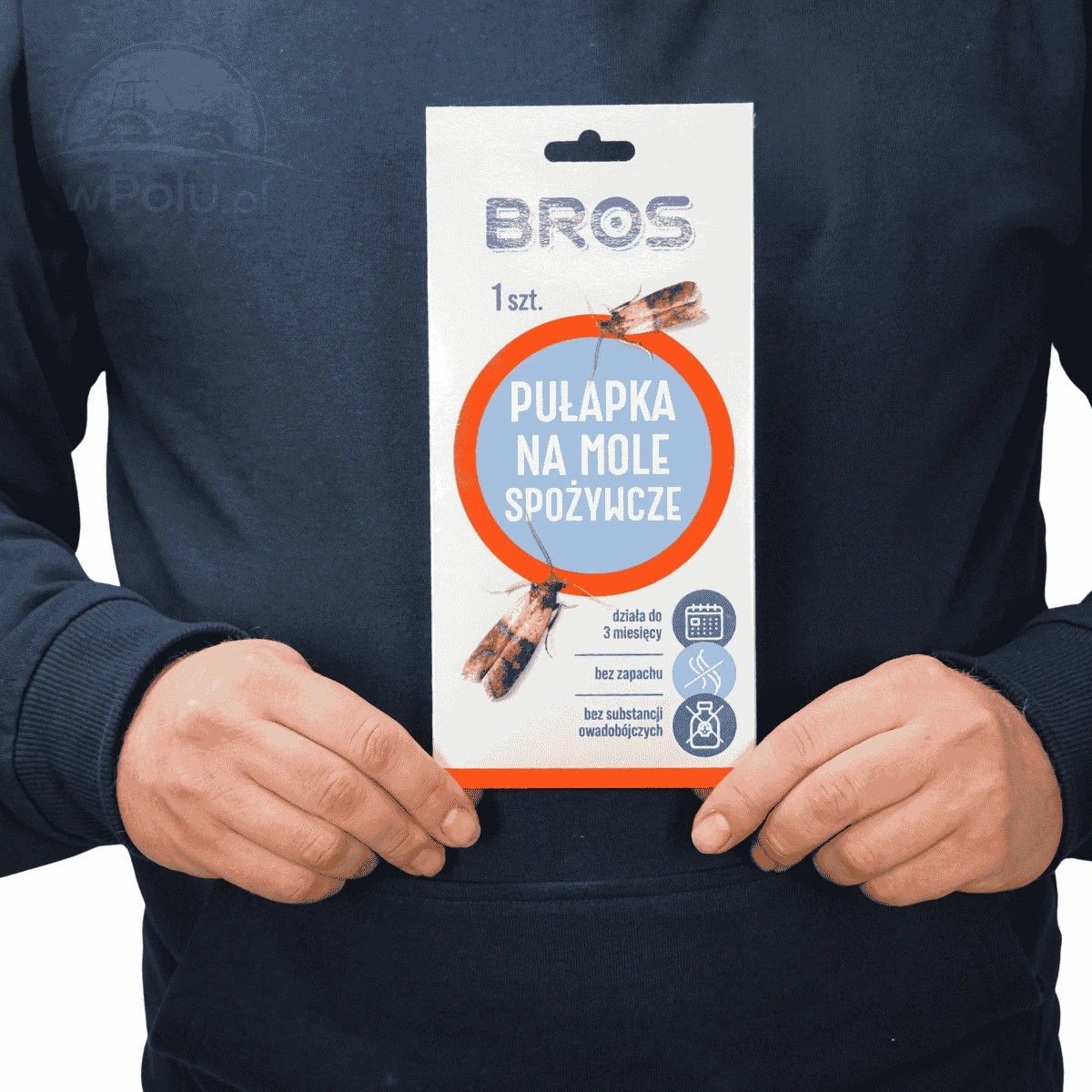 Produkt przeznaczony do zwalczania moli spożywczych w pomieszczeniach takich jak kuchnie i spiżarnie oraz bezpośrednio w szafach z produktami spożywczymi. Bros Pułapka Feromonowa na Mole Spożywcze działa do 12 tygodni. Jest łatwa w użyciu i bardzo skuteczna. Dzięki zawartości feromonu w kleju, który pokrywa pułapkę, wabi ona i skutecznie wyłapuje dorosłe samce moli. Pułapkę można przykleić do dowolnej powierzchni lub powiesić wykorzystując otwór w pułapce.