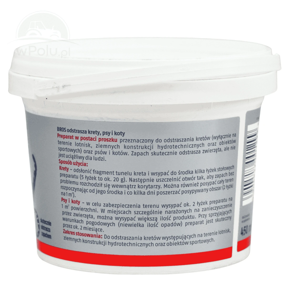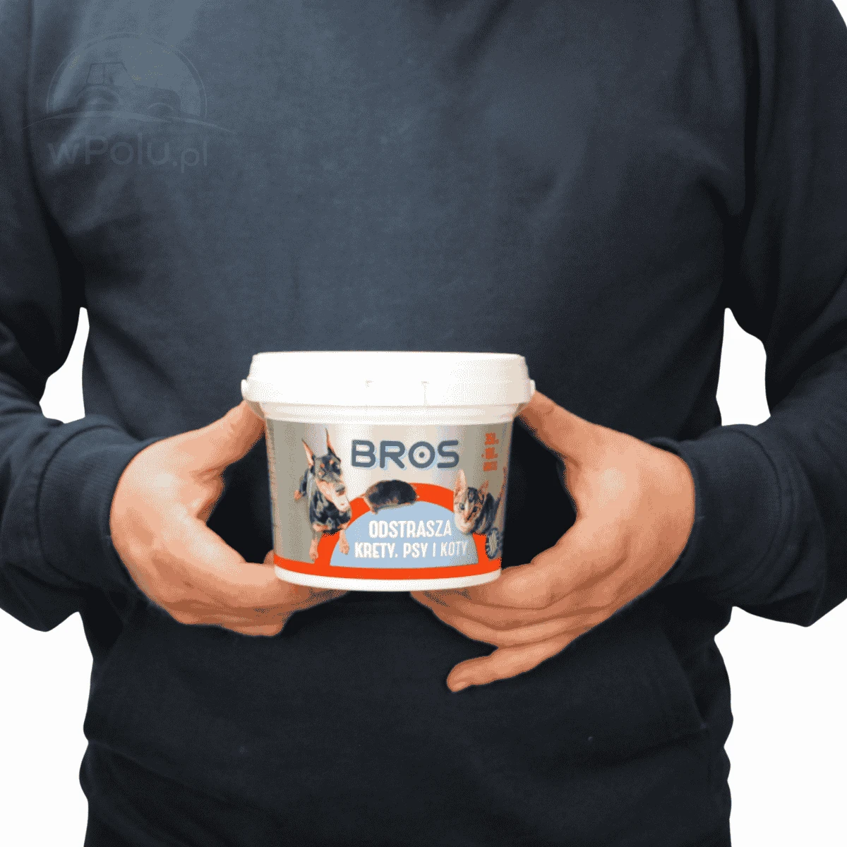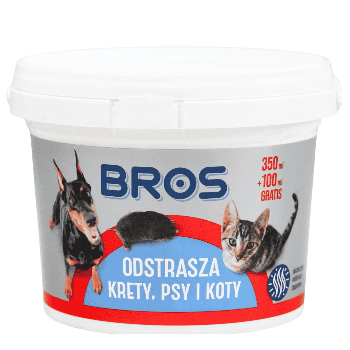 Bros jest to produkt występujący w postaci proszku. Preparat posiada silny zapach, który w naturalny sposób zniechęca psy i koty do znaczenia terytorium w miejscach, w których go zastosowano. Skutecznie działa w warunkach zewnętrznych, dlatego może być stosowany do zabezpieczania tarasów, schodów, narożników murów. Może być też używany wewnątrz klatek schodowych, piwnic oraz innych pomieszczeń narażonych na zanieczyszczenie przez zwierzęta domowe. Dużym plusem jest to, że w żaden sposób nie jest uciążliwy dla ludzi.