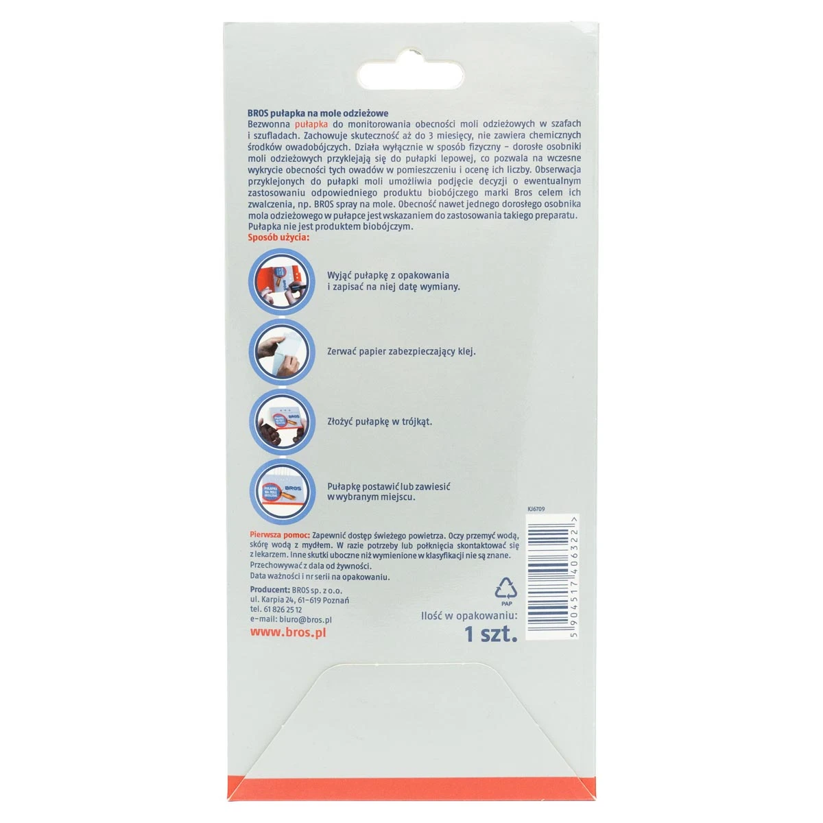 DO RABATU NA WYSYŁKĘ: 1000 złPułapka na mole odzieżowe to bezwonne i nieszkodliwe rozwiązanie do wczesnego wykrywania obecności moli w szafach, szufladach i garderobach. Produkt nie zawiera chemicznych substancji owadobójczych i działa w sposób fizyczny – dorosłe osobniki przyciągane przez pułapkę za pomocą feromonu, przyklejają się do powierzchni lepowej. Dzięki temu można łatwo ocenić stopień zagrożenia i podjąć decyzję o ewentualnym zastosowaniu preparatu biobójczego, np. Bros spray na mole.