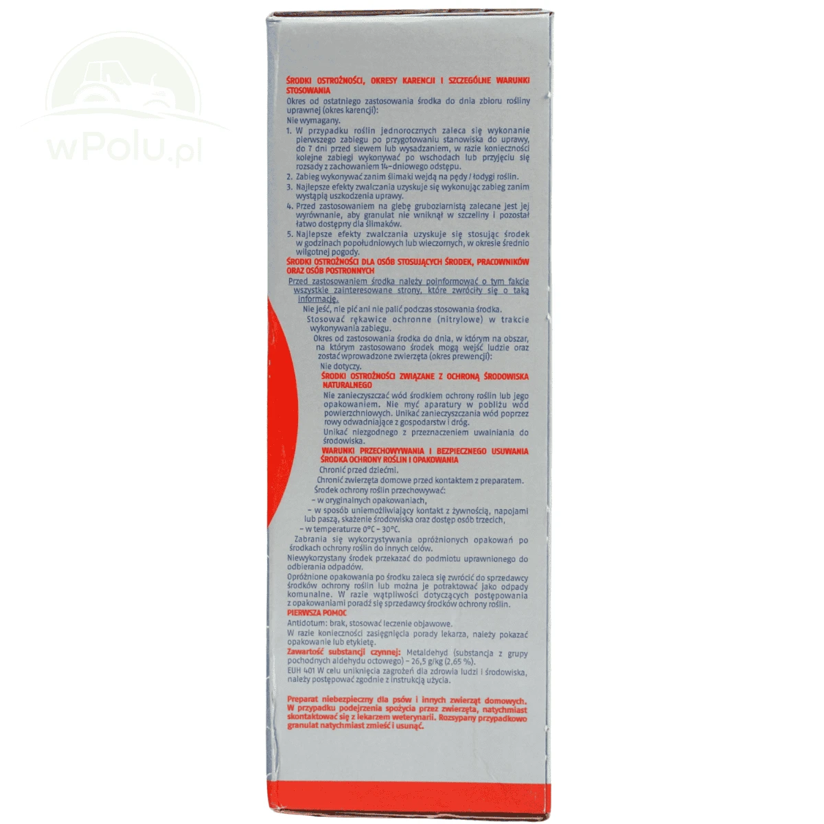 Termin stosowania: Środek stosować po zauważeniu pierwszych szkód wyrządzonych przez ślimaki. Środek rozsypywać równomiernie np. aplikatorem do granulowanych środków ochrony roślin na całej powierzchni gleby między roślinami i wzdłuż brzegów zagonów. Nie posypywać roślin uprawnych.