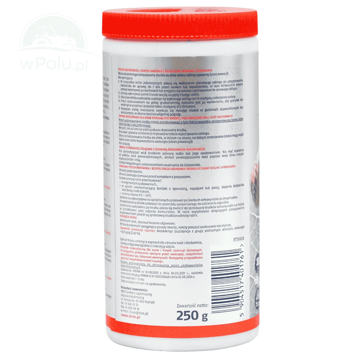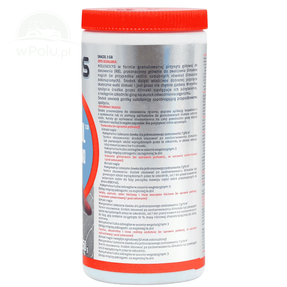 Granulowany preparat o działaniu żołądkowym i kontaktowym do zwalczania ślimaków w niektórych uprawach rolniczych oraz roślinach ozdobnych. Wabi ślimaki i jest chętnie przez nie zjadany. W wyniku spożycia środka ślimaki ulegają odrętwieniu, a następnie giną na skutek odwodnienia. Zawiera gorzką substancję zapobiegającą przypadkowemu spożyciu.