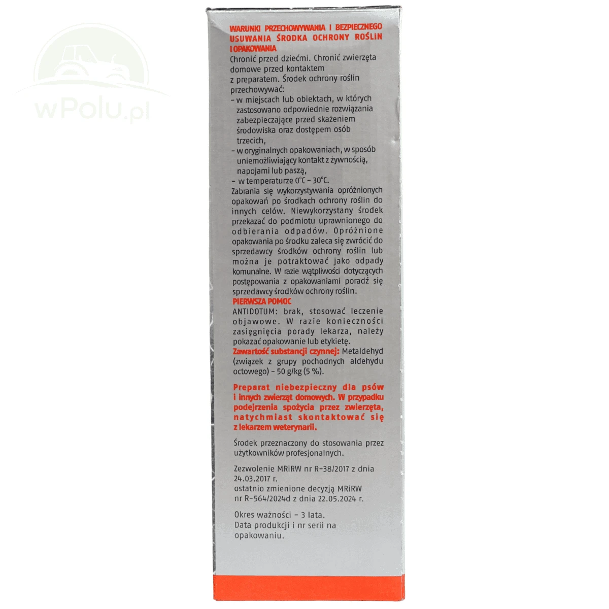 Granulowany preparat o działaniu żołądkowym i kontaktowym do zwalczania ślimaków w niektórych uprawach rolniczych oraz roślinach ozdobnych w uprawie polowej i pod osłonami. Wabi ślimaki i jest chętnie przez nie zjadany. W wyniku spożycia środka ślimaki ulegają odrętwieniu, a następnie giną na skutek odwodnienia. Zawiera gorzką substancję zapobiegającą przypadkowemu spożyciu.