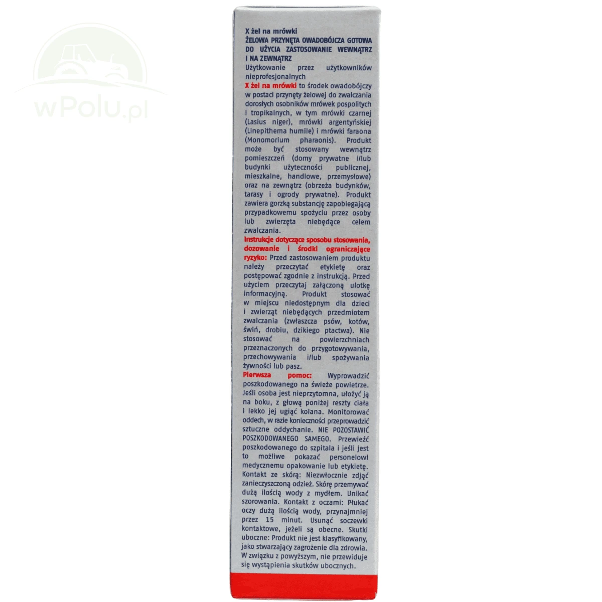 X Żel na Mrówki to skuteczny preparat owadobójczy idealny do zwalczania różnych gatunków mrówek, takich jak mrówka czarna (Lasius niger), mrówka argentyńska (Linepithema humile) oraz mrówka faraona (Monomorium pharaonis). Produkt można stosować zarówno wewnątrz pomieszczeń, jak i na zewnątrz, co czyni go wszechstronnym narzędziem w walce z tymi uciążliwymi owadami. Forma żelowa zapewnia łatwą aplikację: wystarczy nanieść krople lub paski żelu wzdłuż ścieżek mrówek, w szczelinach, szparach lub w pobliżu ich gniazd. Produkt zachowuje skuteczność do 15 dni od zastosowania. Żel na Mrówki X zawiera gorzką substancję, która zapobiega przypadkowemu spożyciu przez ludzi i zwierzęta. Żel na Mrówki X to niezawodny sposób na pozbycie się mrówek zarówno w domu, jak i na zewnątrz, gwarantując długotrwałą ochronę.