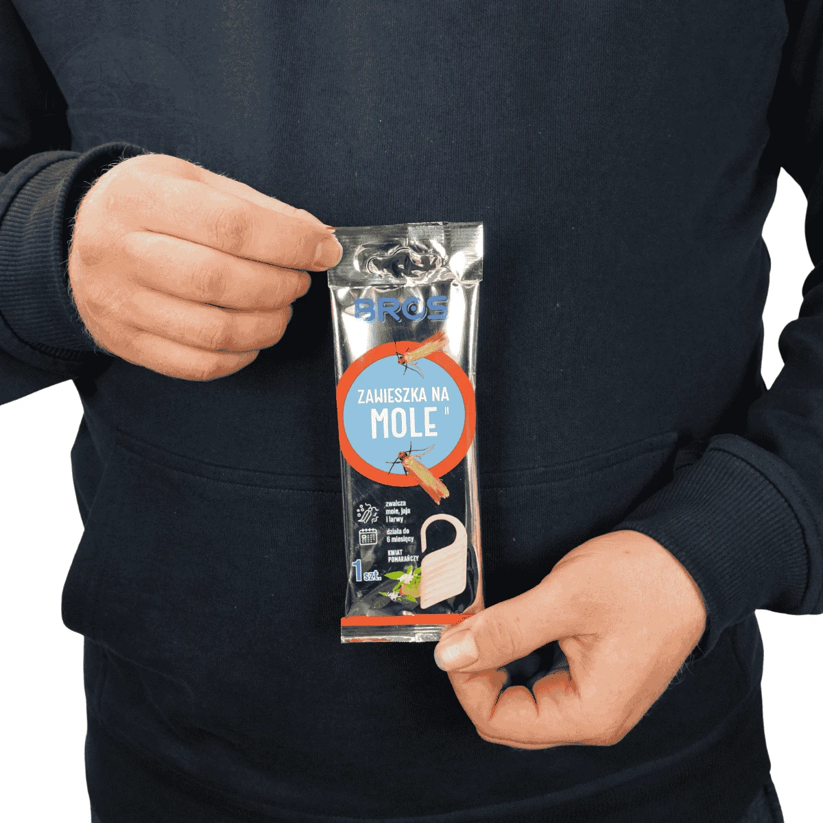 Zawieszka na mole o zapachu pomarańczy to skuteczny preparat do zabezpieczania ubrań przed molami odzieżowymi. Produkt działa kompleksowo, eliminując owady na każdym etapie rozwoju – od jaj, przez larwy, aż po dorosłe osobniki. Prosta forma aplikacji sprawia, że wystarczy wyjąć zawieszkę z opakowania i umieścić ją w szafie, garderobie lub szufladzie, aby rozpocząć ochronę przechowywanych tkanin.