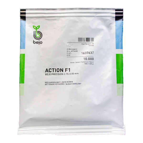Burak ćwikłowy Action F1 to wczesna odmiana mieszana przeznaczona do upraw letnich. Charakteryzuje się szybkim okresem wzrostu oraz długą przydatnością zbiorczą. Burak ćwikłowy profesjonalny. Dość dobrze znosi chwilowe susze. Kulisty, pięknie wybarwiony korzeń nie ma tendencji do tworzenia łykowatych jasnych pierścieni, jest łatwy do mycia. Ma bardzo dobry smak. Posiada niezbyt bujne ulistnienie umożliwiające gęstszy wysiew. Zagęszczenie wysiewu wydłuża okres wegetacji.