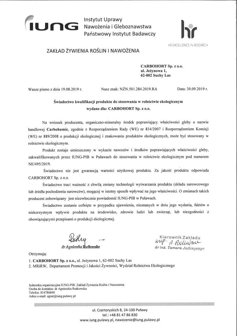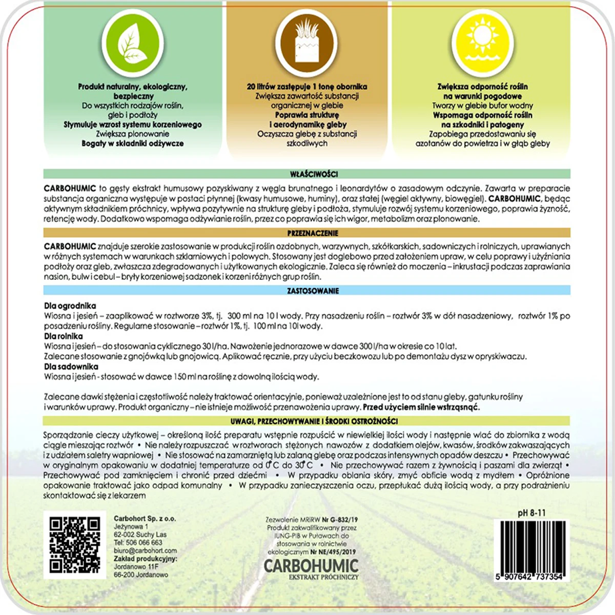 Carbohumic jest atestowanym gęstym ekstraktem z węgla brunatnego - leonardytów barwy ciemnobrunatnej, zawierającym 80 - 95% kwasów humusowych, huminowych i fulwowych, a także znaczące ilości makro i mikroelementów, o zasadowym odczynie. W wodzie tworzy koloidalną zawiesinę nie blokującą systemów fertygacyjnych i dysz opryskiwaczy. Humusowe substancje koloidalne wykazują właściwości sorpcyjne i chelatujące, co zwiększa dostępność dla roślin składników pokarmowych. CARBOHUMIC, jako aktywny składnik próchnicy, w efekcie synergistycznie wpływa pozytywnie na strukturę gleb i podłoży, stymuluje rozwój systemu korzeniowego, poprawia żyzność, odżywianie, wigor i plonowanie roślin.