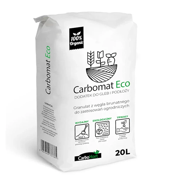 DO RABATU NA WYSYŁKĘ: 1000 złCarbomat Eco to naturalny dodatek glebowy wytwarzany z lignitu (miękkiego węgla brunatnego), przeznaczony do poprawy jakości i struktury gleby. Dzięki wysokiej zawartości materii organicznej oraz kwasów humusowych i fulwowych wspiera żyzność podłoża, rozwój mikroorganizmów glebowych i zdrowy wzrost roślin. Produkt posiada pH 4,5-5,0 i jest w pełni bezpieczny dla środowiska - posiada status produktu ekologicznego.
