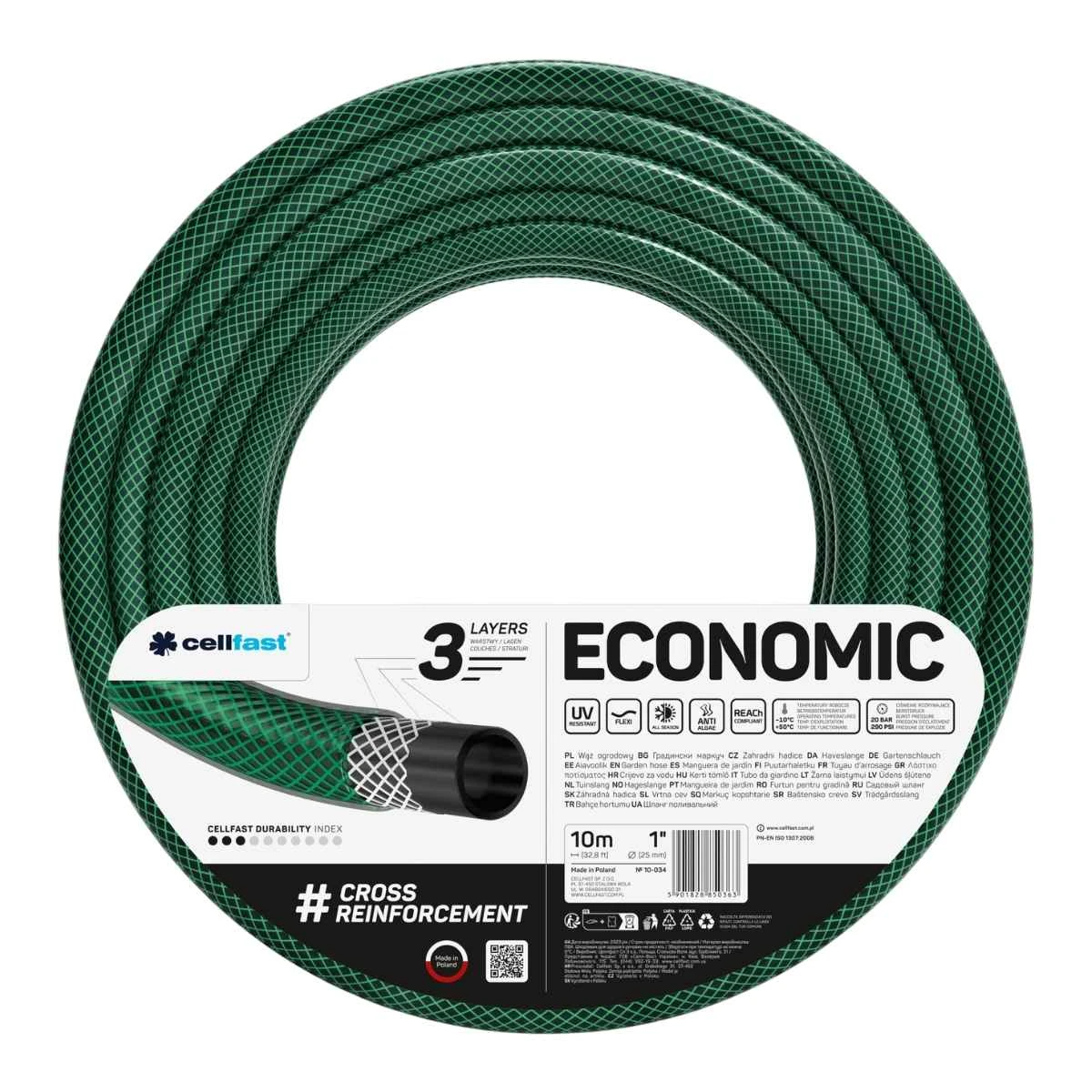 Wąż ogrodowy ECONOMIC 1″ 10 m Cellfast to wytrzymały, trzywarstwowy wąż wykonany z tworzyw sztucznych, zaprojektowany do codziennego nawadniania ogrodów, sadów oraz terenów zieleni. Produkt wyróżnia się poliestrowym oplotem krzyżowym, który zwiększa odporność na ciśnienie, uszkodzenia mechaniczne i wpływ warunków atmosferycznych. Wąż ma tradycyjną, transparentną zieloną kolorystykę oraz wysoką elastyczność, co ułatwia jego rozwijanie i prowadzenie na różnych nawierzchniach.
