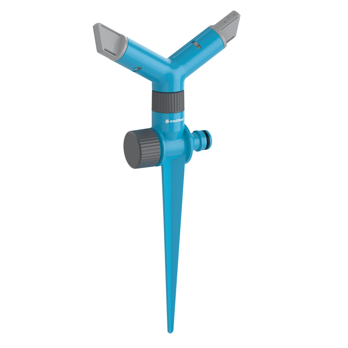 Zraszacz obrotowy dwuramienny od firmy Cellfast na podstawie szpilki to niezawodna opcja do precyzyjnego nawadniania średnich i dużych powierzchni ogrodowych.