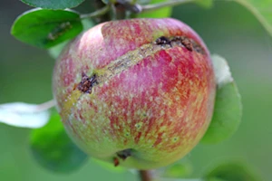 Larwy uszkadzają zawiązki owoców, co objawia się charakterystycznymi wgryzami wypełnionymi ich odchodami. Na owocach można zaobserwować skorkowaciałych smug. Uszkodzone owoce przedwcześnie opadają.