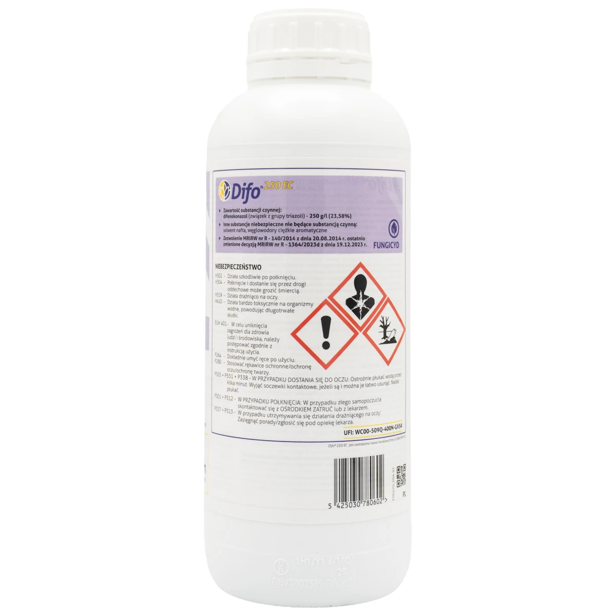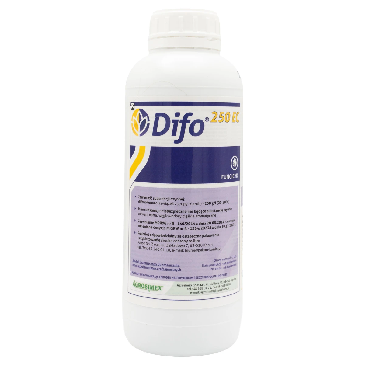 Difo 250 EC jest środkiem grzybobójczym w formie koncentratu do sporządzania emulsji wodnej o działaniu układowym do stosowania zapobiegawczego i interwencyjnego w ochronie jabłoni przed parchem jabłoni i mączniakiem jabłoni oraz grusz przed parchem grusz. W zwalczaniu parcha środek Difo 250 EC wykazuje także działanie wyniszczające. Środek przeznaczony do stosowania przy użyciu samobieżnych lub ciągnikowych opryskiwaczy polowych, samobieżnych lub ciągnikowych opryskiwaczy sadowniczych i opryskiwaczy ręcznych.