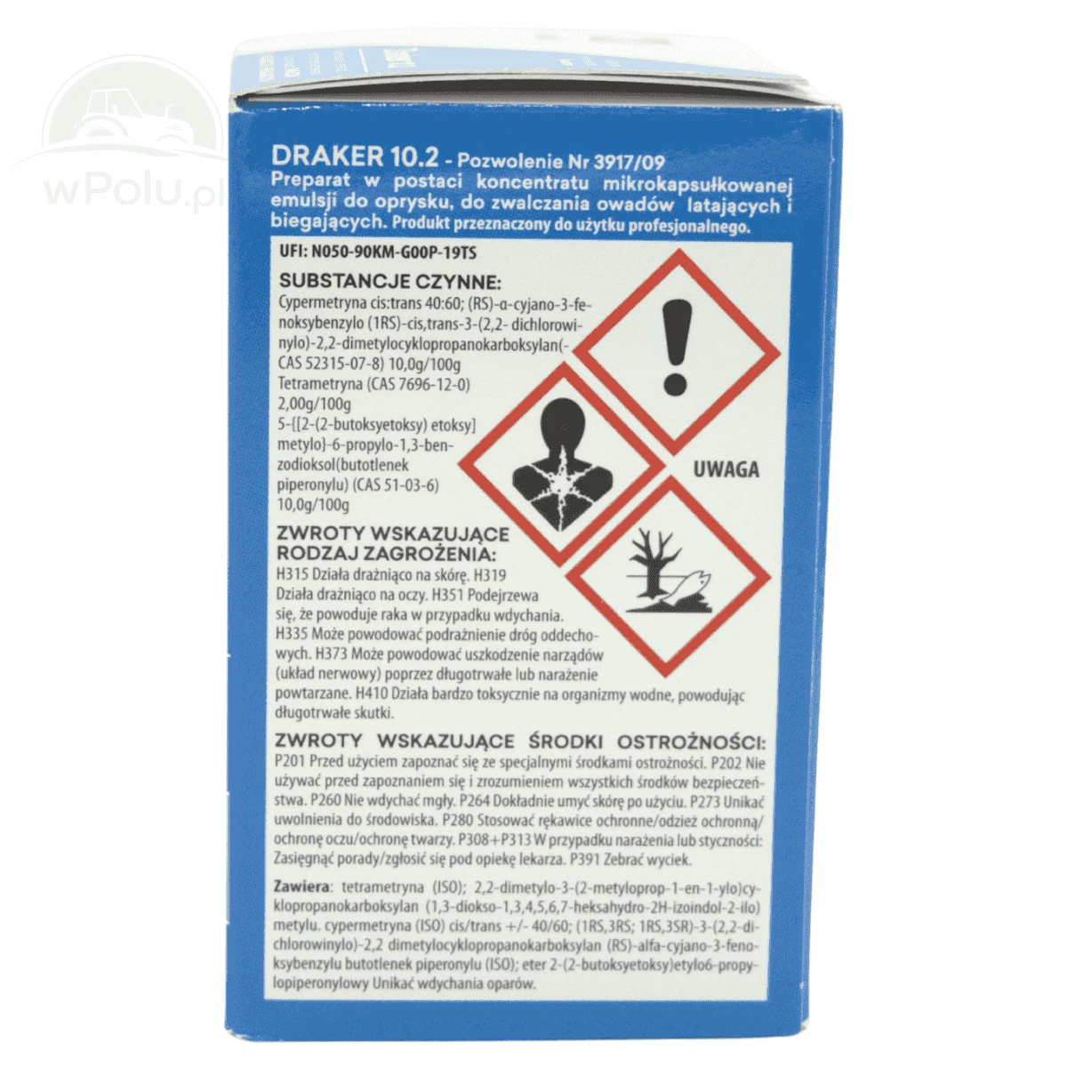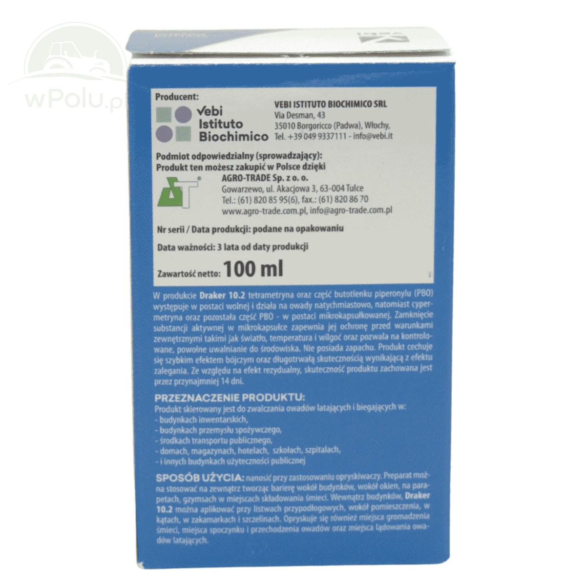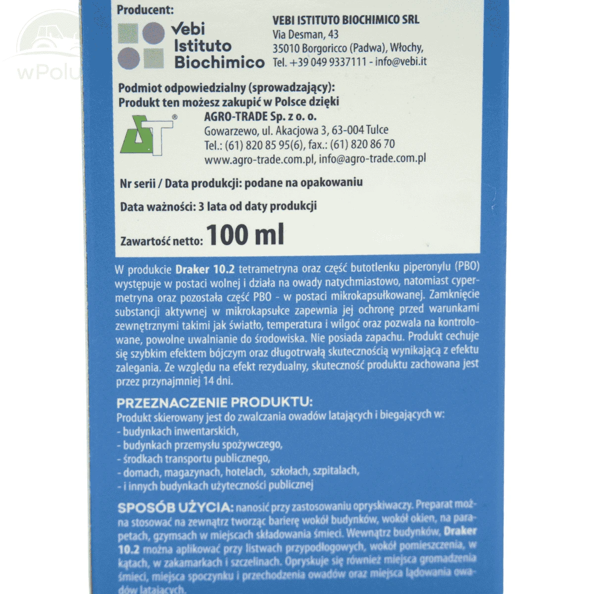 Draker 10.2 marki VEBI to skuteczny insektycyd, pomagający w walce z owadami latającymi i biegającymi. Dzięki aż trzem substancjom czynnym to mocny i długo działający oprysk, zwalczający takie owady, jak: