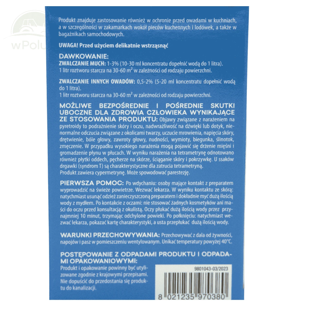 To insektycyd wszechstronnego użytku, świetnie sprawdzający się zarówno wewnątrz budynków, jak i na zewnątrz – w altanach, pod wiatami czy wszędzie tam, gdzie występuje zagrożenie ze strony owadów.