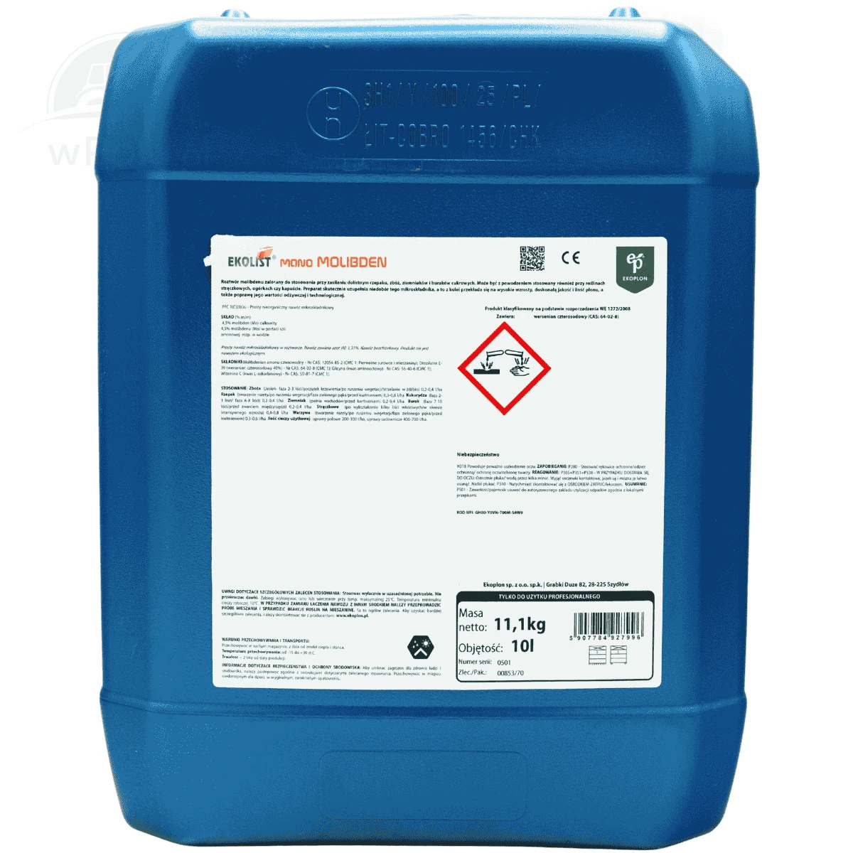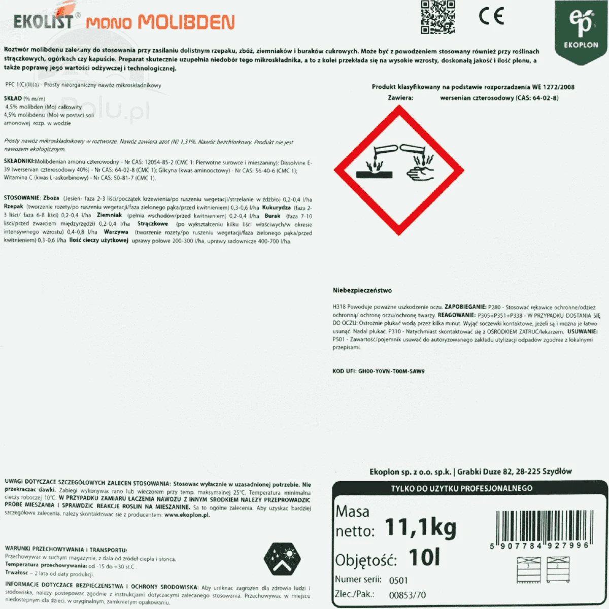 Ekolist Mono Molibden jest płynnym skoncentrowanym nawozem dolistnym, zalecanym do stosowania przy zasilaniu dolistnym rzepaku, zbóż, ziemniaków, buraków cukrowych, a także roślin strączkowych, ogórków, i kapusty. Molibden jest niezbędny do wiązania azotu atmosferycznego przez bakterie korzeniowe i wolnożyjące, intensyfikuje przemiany azotu i fosforu w roślinach, wspomaga przyswajanie żelaza, a jego stosowanie przekłada się na wysokie wzrosty, doskonałą jakość i ilość plonu oraz poprawę wartości odżywczej i technologicznej upraw.