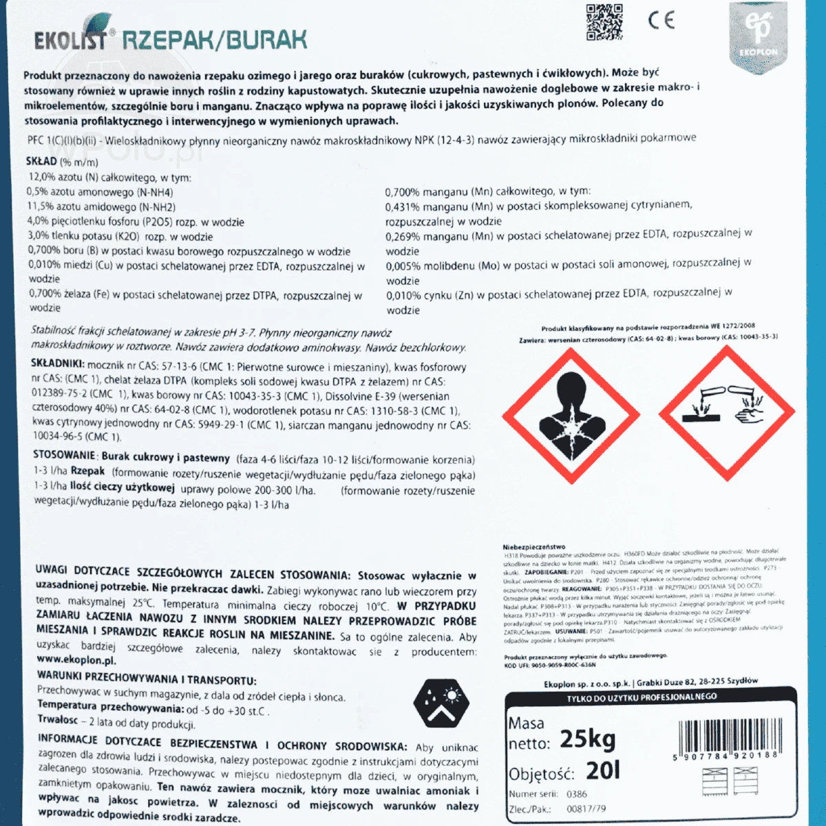 Ekolist Rzepak/Burak jest płynnym nawozem dolistnym, który skutecznie likwiduje i zapobiega powstawaniu objawów niedoboru składników pokarmowych w uprawach rzepaku i buraków cukrowych. Produkt zawiera wysoko przyswajalne makro- i mikroelementy w formie chelatów EDTA i DTPA, co wpływa na polepszenie wzrostu roślin oraz zwiększenie ilości i jakości plonu. Wzbogacony o ComplexActive, wzmacnia odporność roślin na stresy fizjologiczne i na niekorzystne warunki atmosferyczne. Rekomendowany do stosowania na wszystkich rodzajach gleb.
