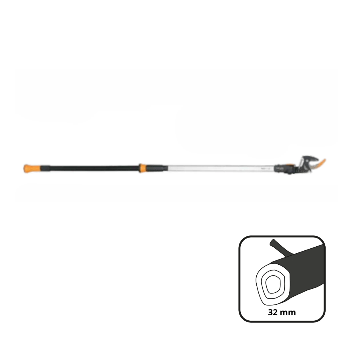 Fiskars PowerGear™ X UPX82 to krótki sekator tyczkowy do bezpiecznego cięcia gałęzi bez użycia drabiny. Aluminiowy trzonek o długości 1,65 m i lekka konstrukcja (ok. 1,14 kg) zapewniają dobrą manewrowość, a pomarańczowy wspornik cięcia poprawia widoczność w gęstej koronie. Głowica tnąca obraca się do 230°, co ułatwia ustawienie narzędzia pod właściwym kątem. Miękki, antypoślizgowy chwyt SoftGrip™ i stabilna stopka poprawiają komfort i kontrolę pracy.