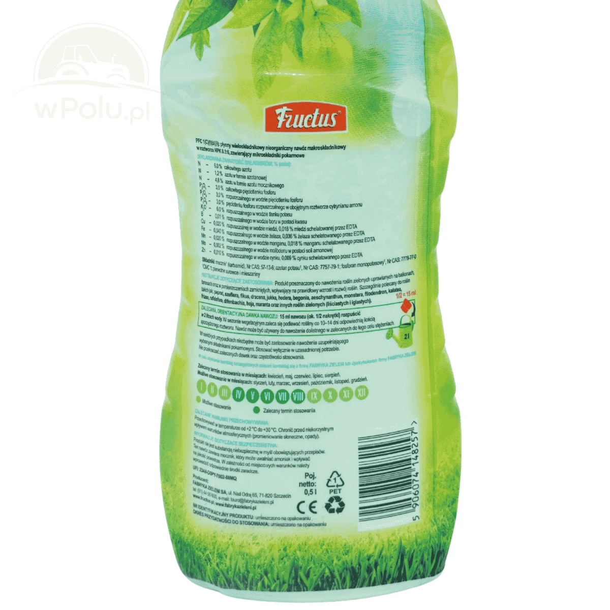 Fructus do roślin zielonych to płynny, wieloskładnikowy, nieorganiczny nawóz mikroskładnikowy w formie roztworu NPK 6:3:6 z dodatkiem mikroelementów odżywczych. Przeznaczony do nawożenia roślin zielonych uprawianych na balkonach, tarasach oraz w pomieszczeniach zamkniętych. Wpływa na prawidłowy wzrost i rozwój roślin.