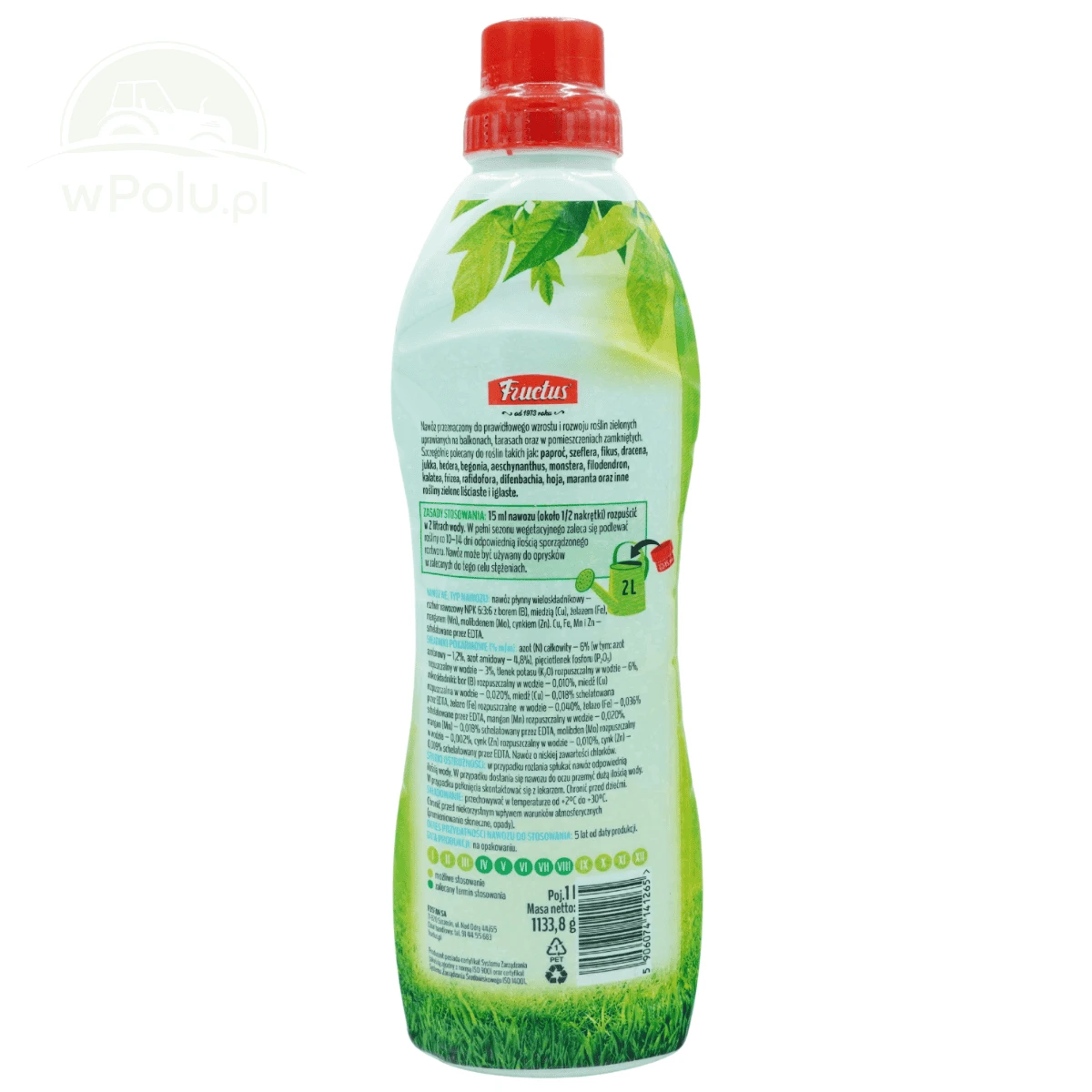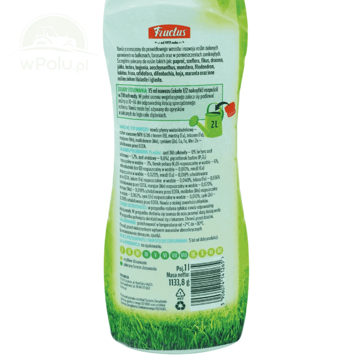 Fructus do roślin zielonych to płynny, wieloskładnikowy, nieorganiczny nawóz mikroskładnikowy w formie roztworu NPK 6:3:6 z dodatkiem mikroelementów odżywczych. Przeznaczony do nawożenia roślin zielonych uprawianych na balkonach, tarasach oraz w pomieszczeniach zamkniętych. Wpływa na prawidłowy wzrost i rozwój roślin.