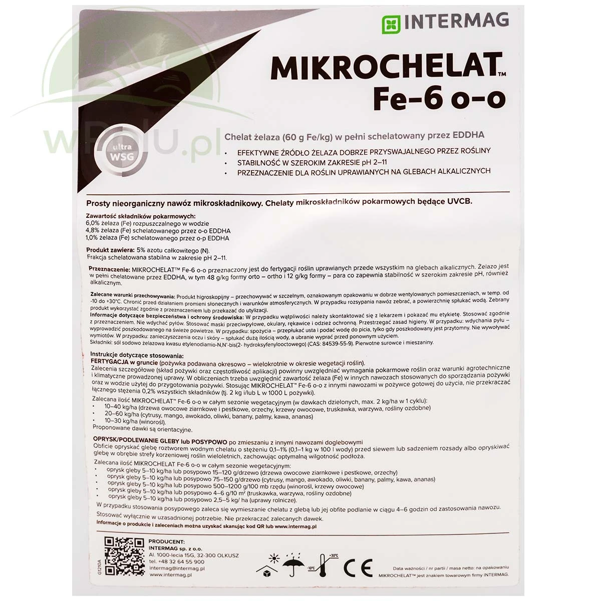 Mikrochelat Fe-6 zawiera 60 g/kg (6%) żelaza schelatowane przez EDTA+DTPA. Żelazo (Fe) w formie chelatu jest szybciej wchłaniane, przemieszczane i przyswajane przez rośliny niż żelazo dostarczane roślinom w innych formach. Nawóz korzystnie wpływa na wielkość i jakość plonu.