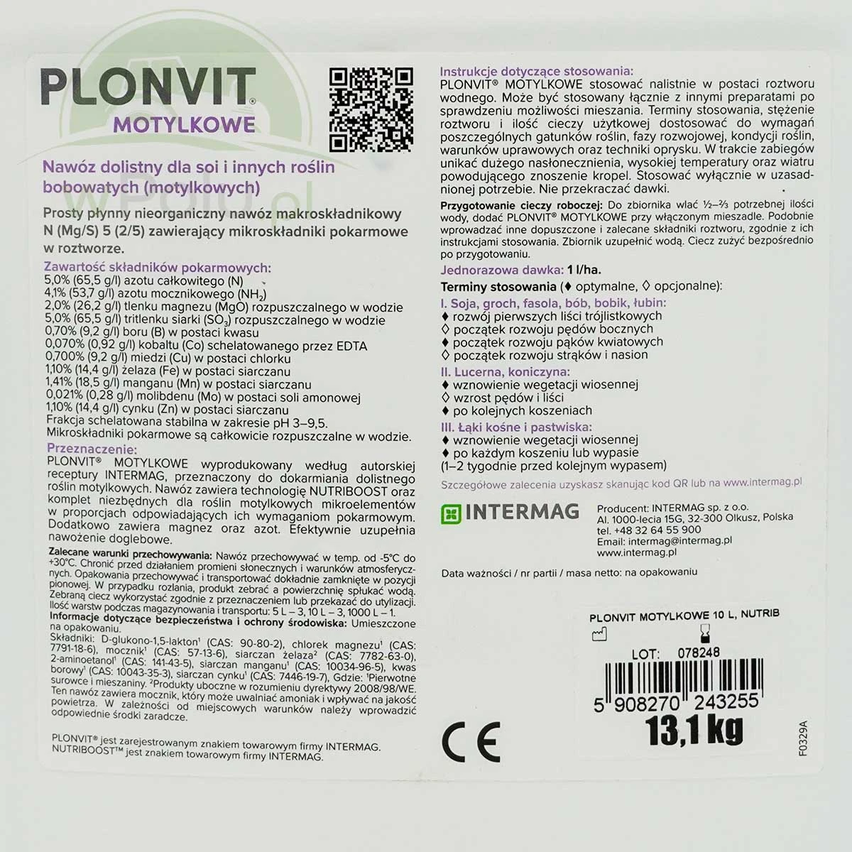 PLONVIT® MOTYLKOWE jest dolistnym, wieloskładnikowym nawozem mikroelementowym przeznaczonym do dokarmiania wszystkich gatunków roślin motylkowych. Zawiera kompletną kompozycję starannie dobranych mikroelementów w ilościach i proporcjach dostosowanych do specyficznych potrzeb pokarmowych tej grupy roślin, co sprzyja ich prawidłowemu wzrostowi, rozwojowi oraz efektywnemu wykorzystaniu potencjału plonowania. Preparat przeznaczony do aplikacji dolistnej umożliwia szybkie i skuteczne uzupełnienie mikroelementów, szczególnie w okresach zwiększonego zapotrzebowania roślin lub przy ograniczonej dostępności składników pokarmowych z gleby.