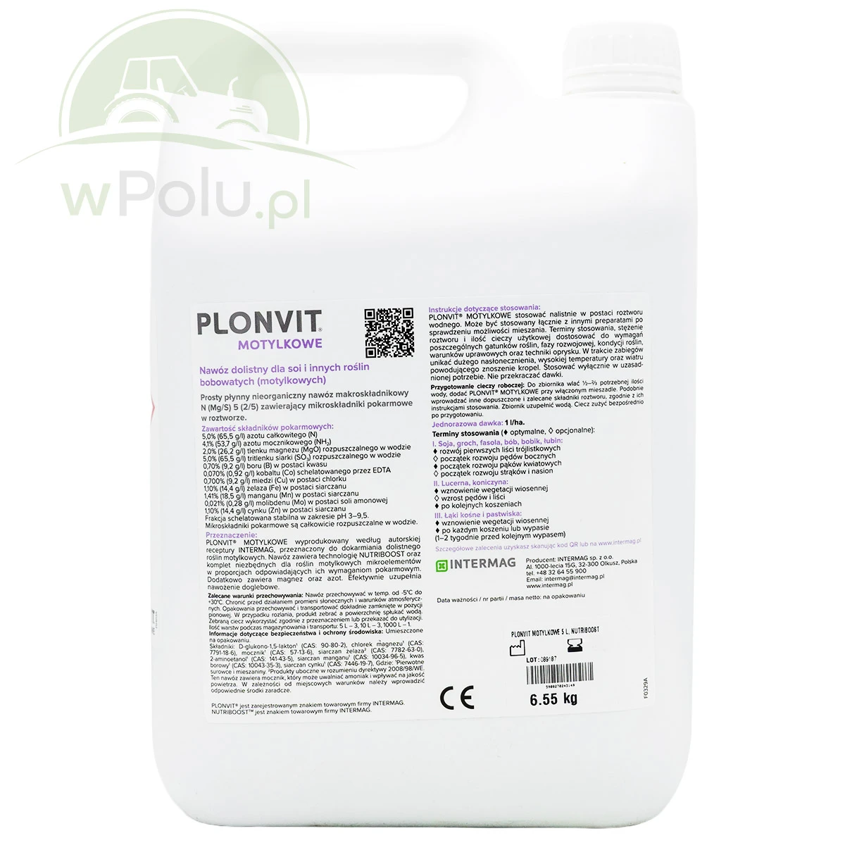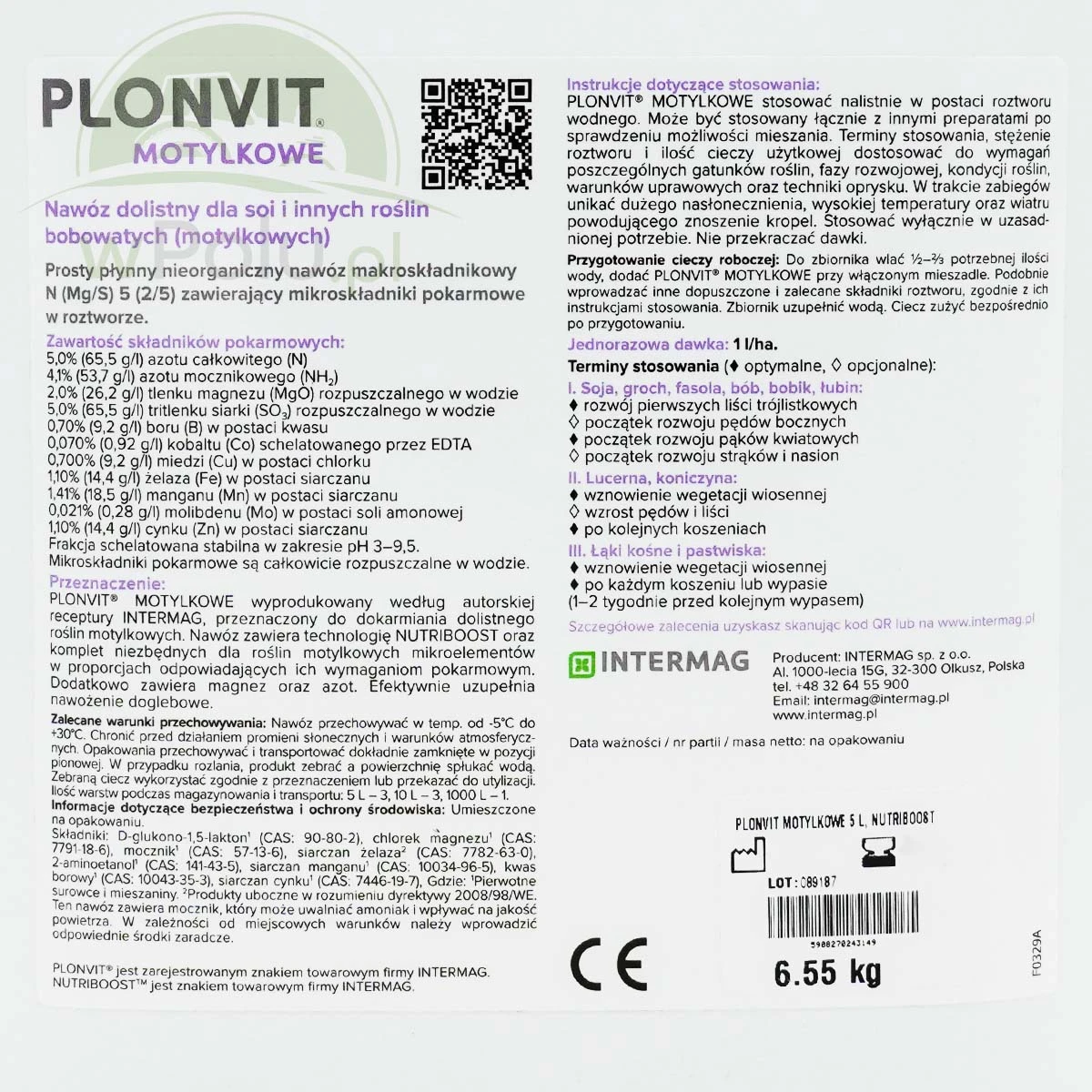 PLONVIT® MOTYLKOWE to specjalistyczny, wieloskładnikowy nawóz mikroelementowy stosowany dolistnie w uprawach roślin motylkowych. Formuła nawozu oparta jest na kompletnym zestawie mikroelementów dobranych w proporcjach odpowiadających wymaganiom pokarmowym tej grupy roślin, co pozwala skutecznie wspierać ich wzrost, prawidłowy rozwój oraz procesy związane z budowaniem plonu. Aplikacja dolistna umożliwia szybkie i efektywne dostarczenie składników odżywczych, szczególnie w okresach wzmożonego zapotrzebowania lub w sytuacjach, gdy pobieranie mikroelementów z gleby jest ograniczone.