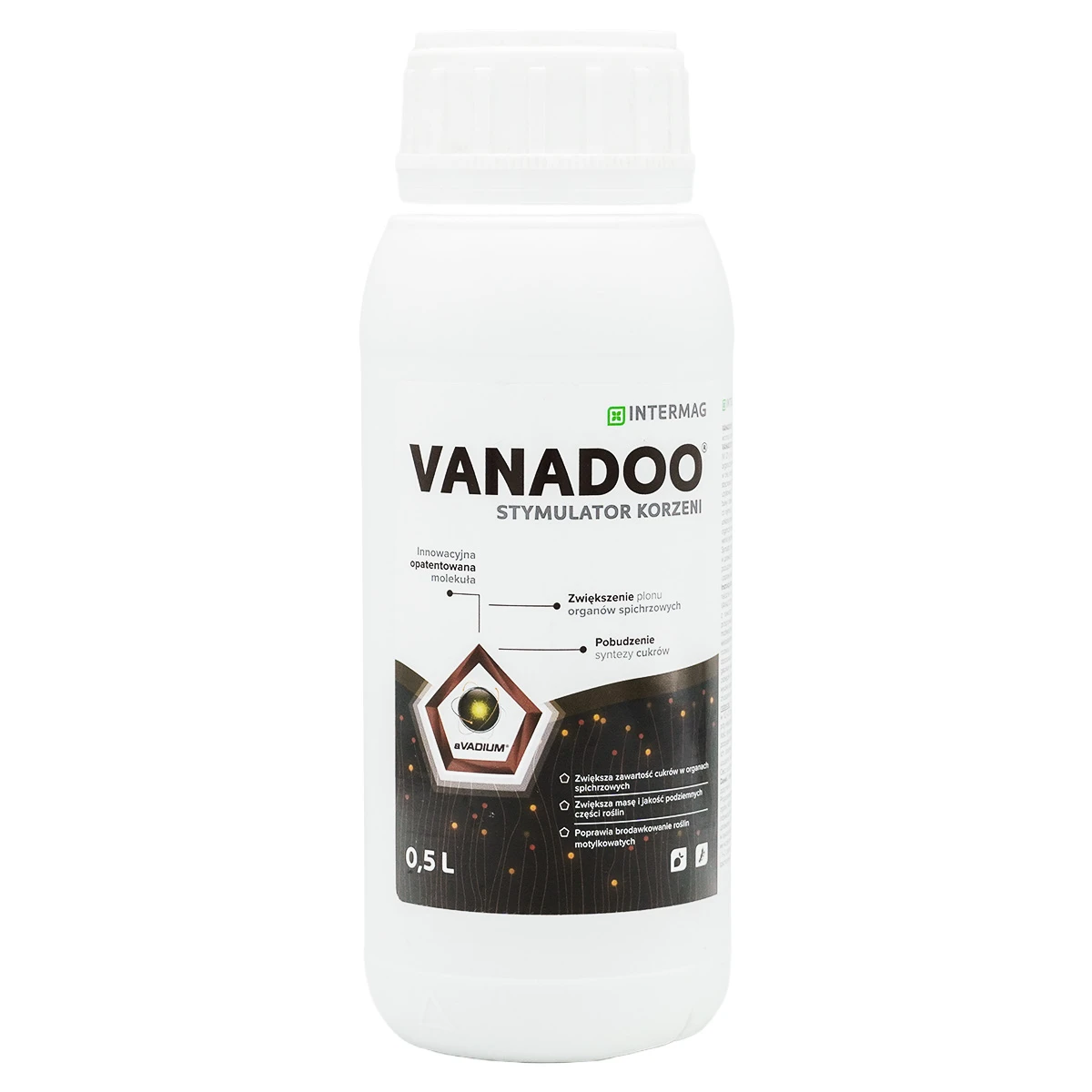 Unikalny biostymulator do stosowania dolistnego pozytywnie wpływający na wielkość i jakość plonu organów spichrzowych. Polecany jest do stosowania w uprawach roślin o podziemnych częściach użytkowych. Badania przeprowadzone przez firmę Intermag potwierdzają wysoką efektywność działania związków wanadu.