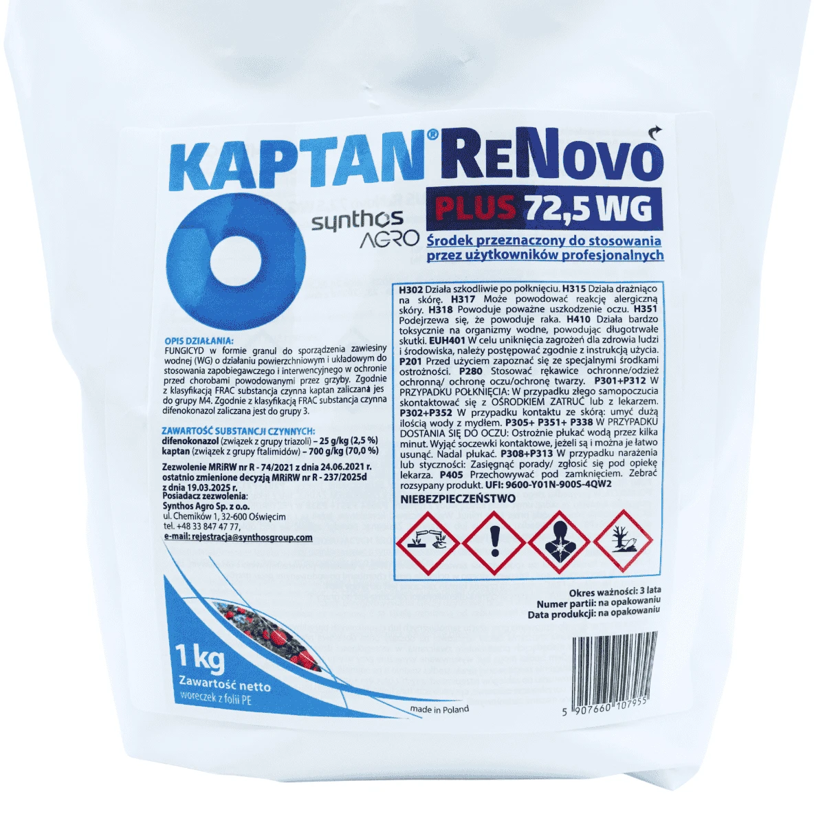 Dwuskładnikowa formuła łącząca kontaktowe i układowe działanie, szerokie spektrum w sadach, możliwość użycia zapobiegawczo i interwencyjnie oraz wygodna formulacja WG sprawiają, że Kaptan Plus ReNovo 72,5 WG to pewny wybór do ochrony plonu i jakości owoców. Jeśli zależy Ci na skutecznej i elastycznej ochronie – ten produkt spełni te oczekiwania.