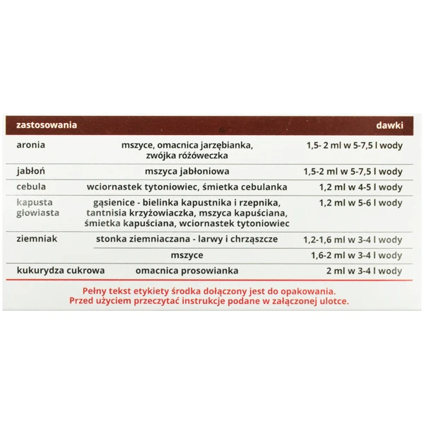 | mszyca jabłoniowa | jabłoń | 1,5-2ml w 5-7,5 l wody/100m2 |