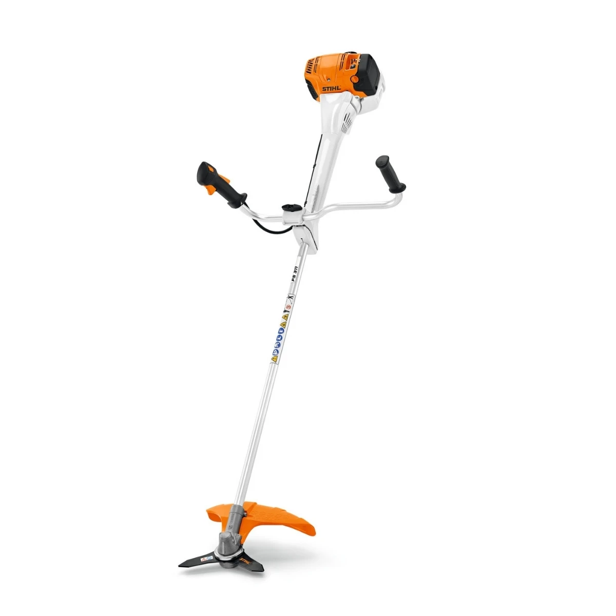Kosa spalinowa STIHL FS 311 to profesjonalne urządzenie przeznaczone do intensywnych prac przy koszeniu traw, zarośli i terenów przydrożnych. Wyposażona w silnik STIHL 4-MIX®, łączy wysoką moc z niską masą – jedynie 7,2 kg. Na zdjęciu widoczna jest solidna konstrukcja z dominującymi barwami pomarańczową i białą, ergonomiczny oburęczny uchwyt oraz osłona tnąca w kolorze pomarańczowym. Uchwyt wielofunkcyjny zintegrowany z przyciskiem stop umożliwia wygodną obsługę jedną ręką, a cała konstrukcja jest zoptymalizowana pod kątem komfortu i płynności pracy.