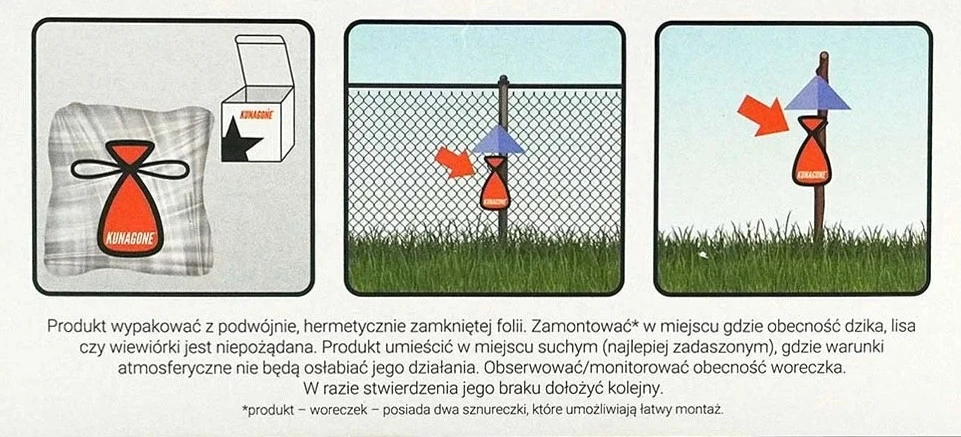 Produkt przeznaczony jest do odstraszania dzików, lisów, wiewiórek i innych dzikich zwierząt z ogrodów, sadów czy działek. Zapach wydzielany przez woreczki Kunagone tworzy barierę zapachową, która skutecznie zniechęca zwierzęta do zbliżania się do danego miejsca. Dzięki temu można w prosty sposób zabezpieczyć swoje otoczenie przed niechcianymi gośćmi i zniszczeniami.