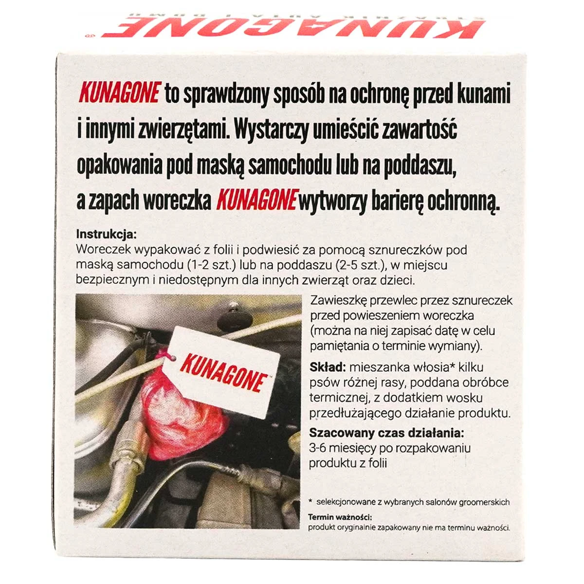 Kunagone działa na zasadzie naturalnego odstraszania zapachem psa – naturalnego wroga kun. Woreczki wypełnione są mieszanką włosia kilku psów różnych ras, poddaną obróbce termicznej i wzbogaconą o wosk roślinny oraz kompozycję zapachową przedłużającą efekt działania. Zapach utrzymuje się od 3 do 6 miesięcy, tworząc trwałą barierę ochronną.