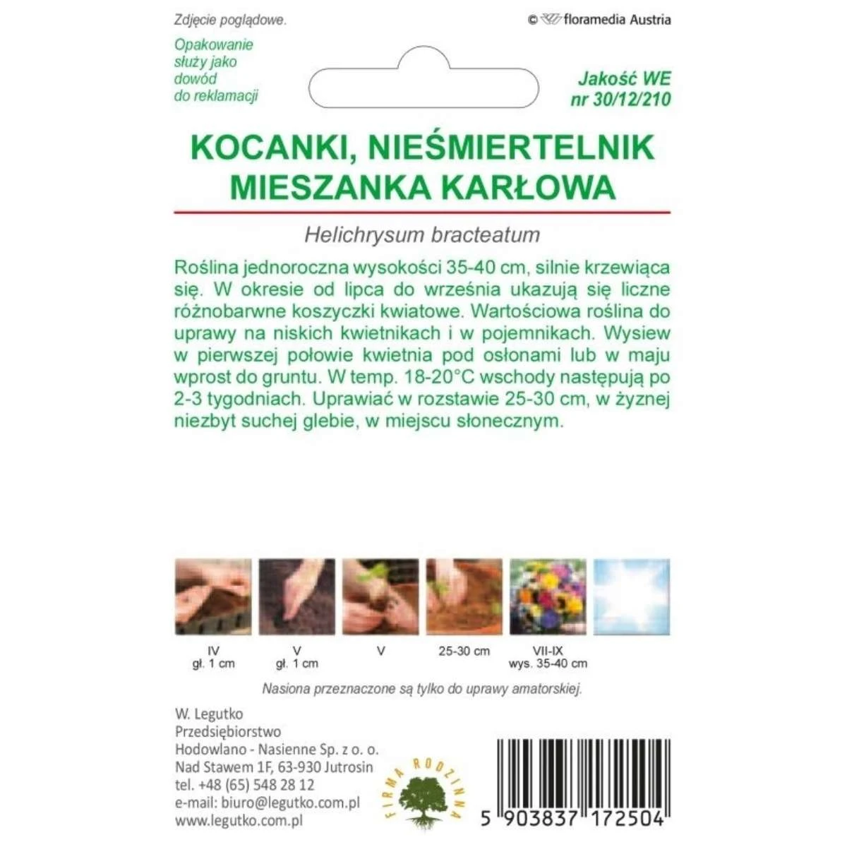 Kocanki, nieśmiertelnik Tom Thumb – mieszanka 0,5 g to jednoroczne rośliny ozdobne o silnie krzewiącym się pokroju, dorastające zwykle do 35–40 cm wysokości. Wytwarzają liczne, twarde i trwałe koszyczki kwiatowe w różnych barwach, które znakomicie nadają się zarówno do dekoracji ogrodowych, jak i do zasuszania. Od lipca do września rośliny tworzą barwne, efektowne kwiatostany, dzięki czemu stanowią atrakcyjny element niskich rabat oraz kompozycji pojemnikowych.