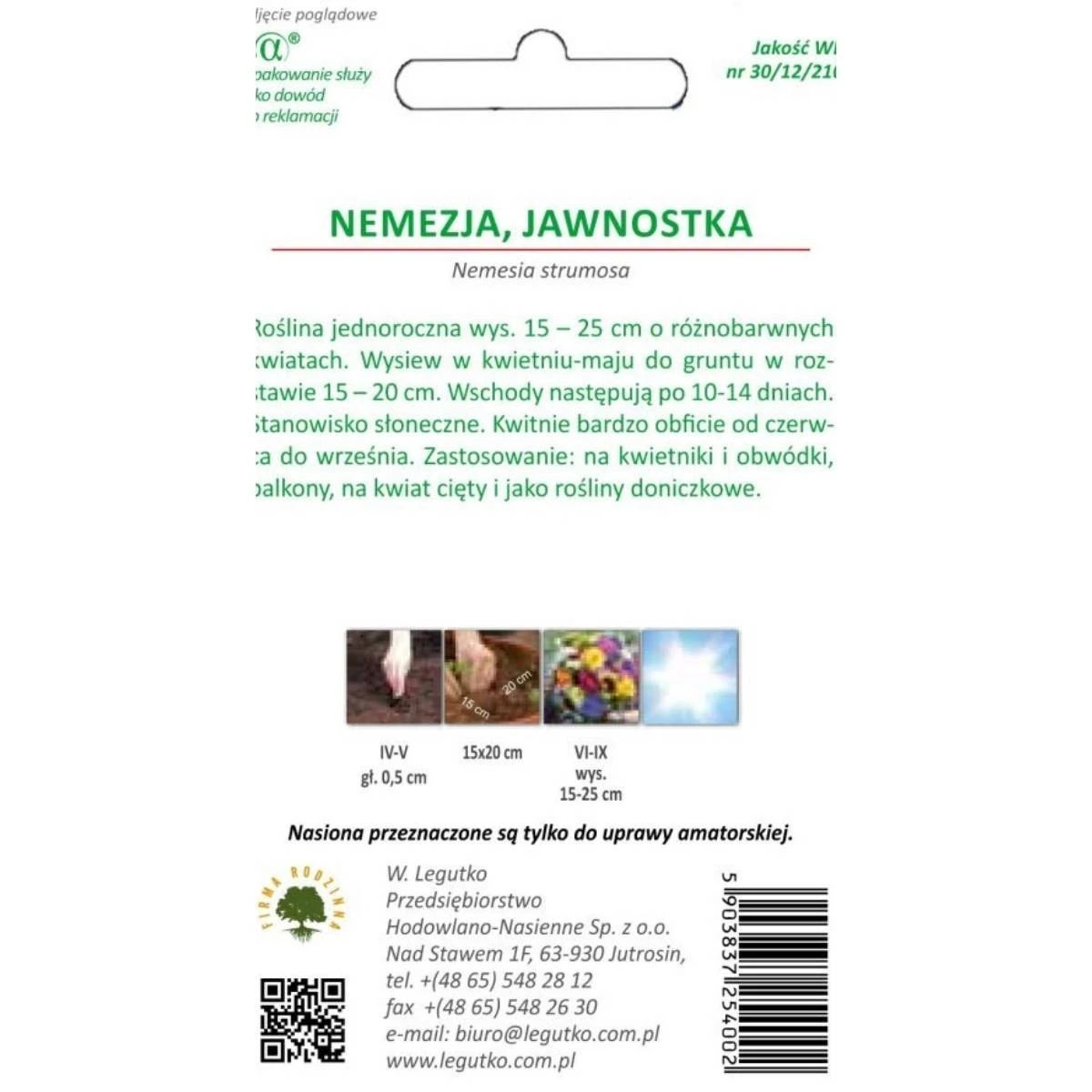 Nemezja, jawnostka – mieszanka 0,3 g to jednoroczna, krzaczasta roślina ozdobna dorastająca do 15–25 cm wysokości, wyróżniająca się obfitym i długotrwałym kwitnieniem. Mieszanka obejmuje różnobarwne kwiaty, choć w wielu nasadzeniach dominują odcienie niebieskie, nadające rabatom świeży, letni charakter. Rośliny tworzą zwarte kępy i kwitną intensywnie od czerwca aż do września. Wysiew nasion przeprowadza się w kwietniu–maju bezpośrednio do gruntu, w rozstawie 15–20 cm. Nemezja najlepiej rośnie na stanowisku słonecznym.
