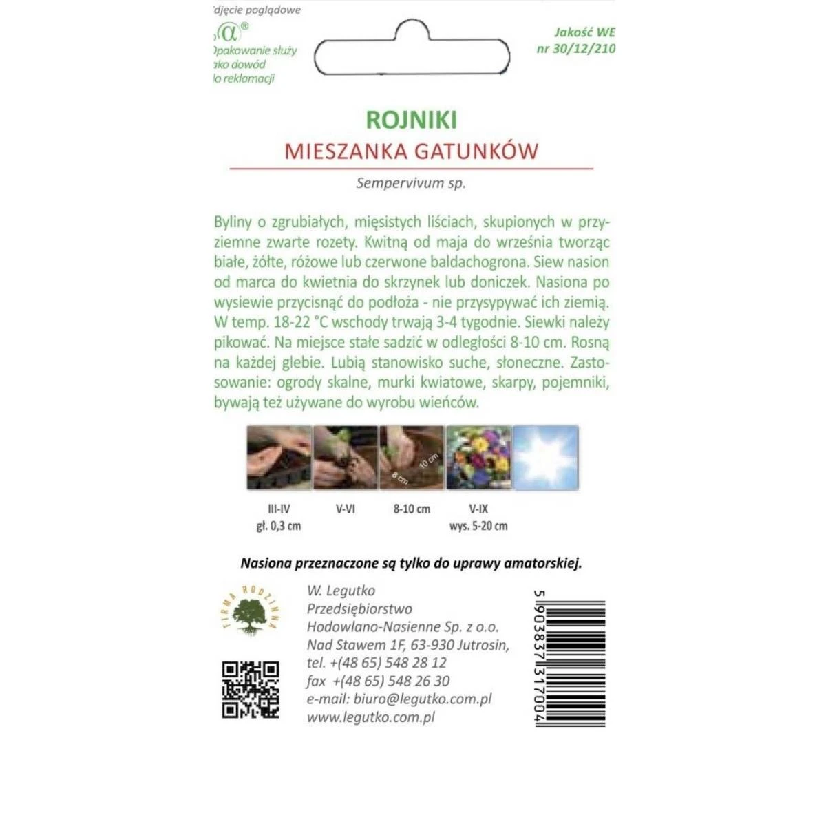 Rojniki – mieszanka gatunków 0,02 g to wieloletnie byliny tworzące zwarte, przyziemne rozety z mięsistych, zgrubiałych liści. Charakteryzują się dużą odpornością i dekoracyjnym wyglądem, dzięki czemu są cenione w ogrodach skalnych i nasadzeniach sucholubnych. Rośliny kwitną od maja do września, tworząc efektowne kwiatostany w odcieniach bieli, żółci, różu i czerwieni. Nasiona wysiewa się od marca do czerwca do skrzynek lub doniczek, lekko dociskając je do podłoża – bez przykrywania ziemią. W temperaturze 18–22°C wschody pojawiają się po 3–4 tygodniach, a młode rośliny wymagają pikowania.