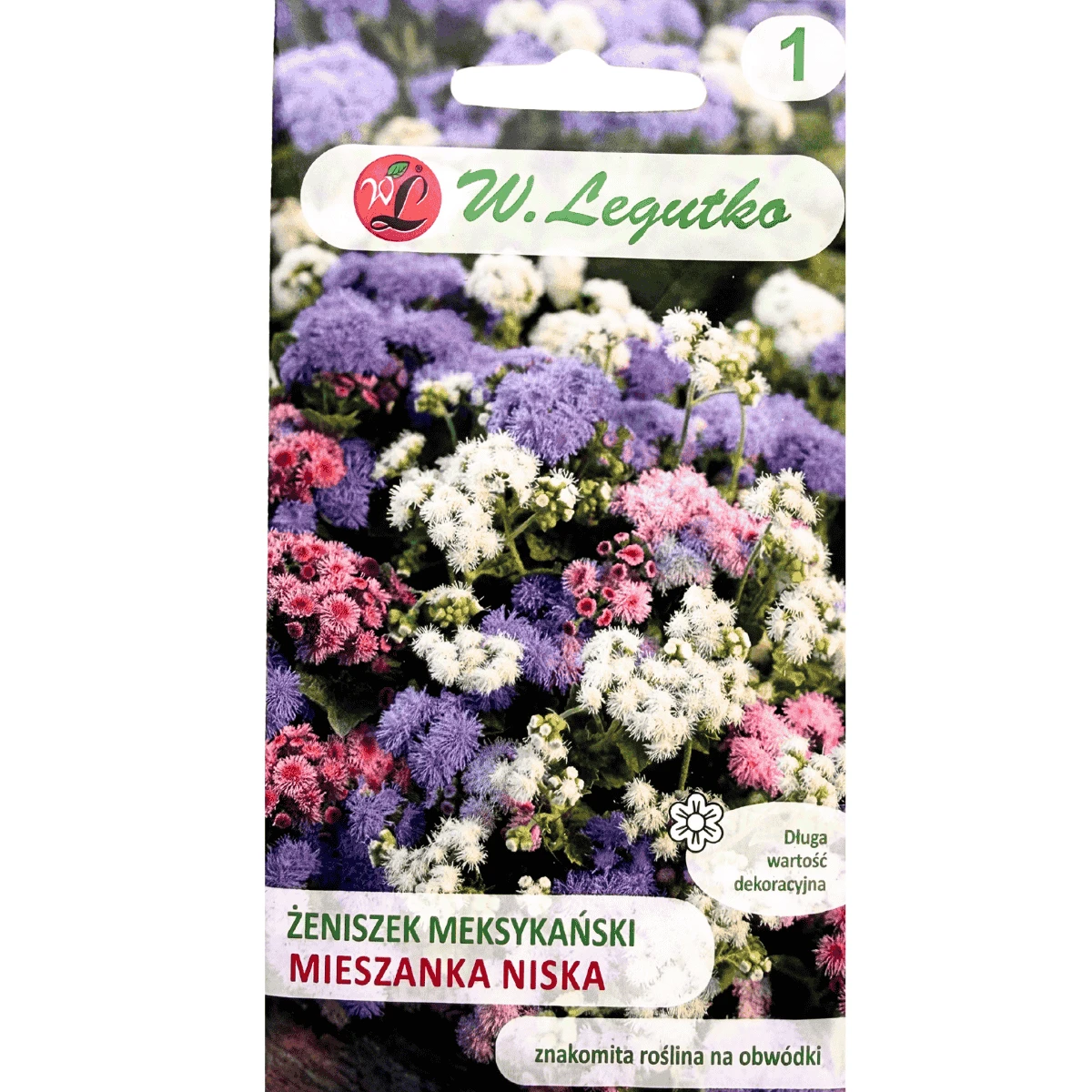 Żeniszek meksykański – mieszanka 0,5 g to jednoroczne, silnie krzewiące się rośliny dorastające do około 20 cm wysokości, tworzące zwarty, lekko spłaszczony pokrój. Odmiana tworzy liczne, gęste kwiatostany baldachowate w barwach białej, różowej i niebieskiej, które nadają roślinom wyjątkowo dekoracyjny wygląd. Żeniszek kwitnie długo – od czerwca aż do pierwszych jesiennych przymrozków – dzięki czemu świetnie sprawdza się jako roślina rabatowa i obwódkowa, a także do uprawy w pojemnikach.