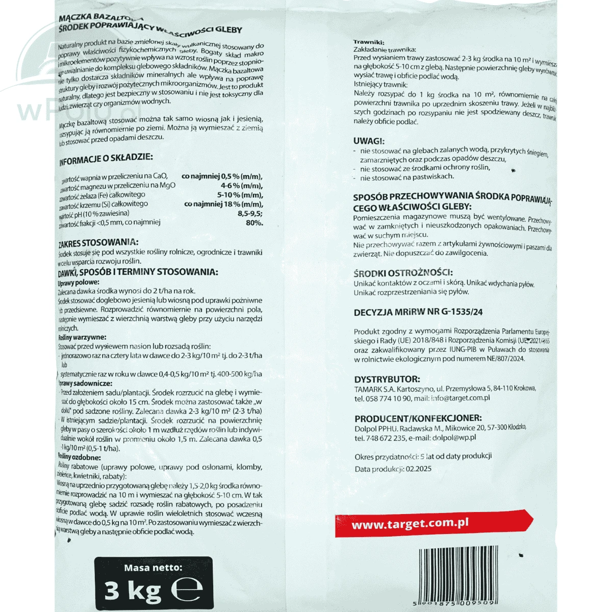 | niedobór składników pokarmowych (nawożenie) | rośliny ozdobne, drzewa i krzewy owocowe, warzywa, trawniki | Zastosowana dawka produktu zależy od jakości gleby i rodzaju uprawy. Przeciętnie w ogrodach na urodzajnych glebach wystarczy 2-3kg na 100m2 ogrodu. Przed założeniem trawnika i do pierwszego nawożenia na glebach bardzo ubogich można dawkę zwiększyć do 1,5-3kg na 10m2 uprawy. W uprawach sadowniczych zaleca się dawkować 10-15kg mączki bazaltowej na 100m2. |