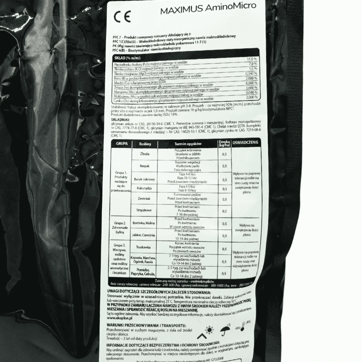 Maximus AminoMicro to nawóz bogaty w mikroelementy skompleksowane glicyną przeznaczony głównie dla upraw warzywnych, sadowniczych oraz rolniczych. Charakteryzuje się zwiększoną zawartością żelaza, co intensyfikuje procesy fotosyntezy i wspomaga odporność roślin. Produkt zawiera również formułę MPC2, która stymuluje wzrost i rozwój roślin, pomaga im przetrwać niekorzystne warunki takie jak susza czy wysoka temperatura i zapewnia efektywne wykorzystanie energii.