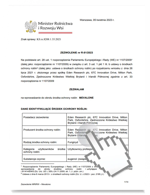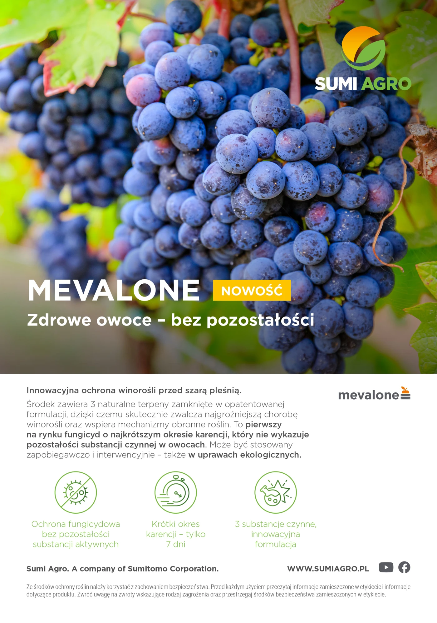 Mevalone to pierwszy na rynku fungicyd z terpenami (eugenol, geraniol i tymol) w innowacyjnej formulacji, do stosowania zapobiegawczego i interwencyjnego na szarą pleśń i gorzką zgniliznę w uprawach jabłoni i winorośli