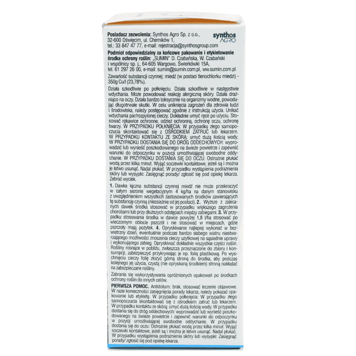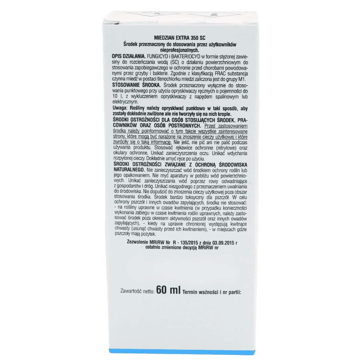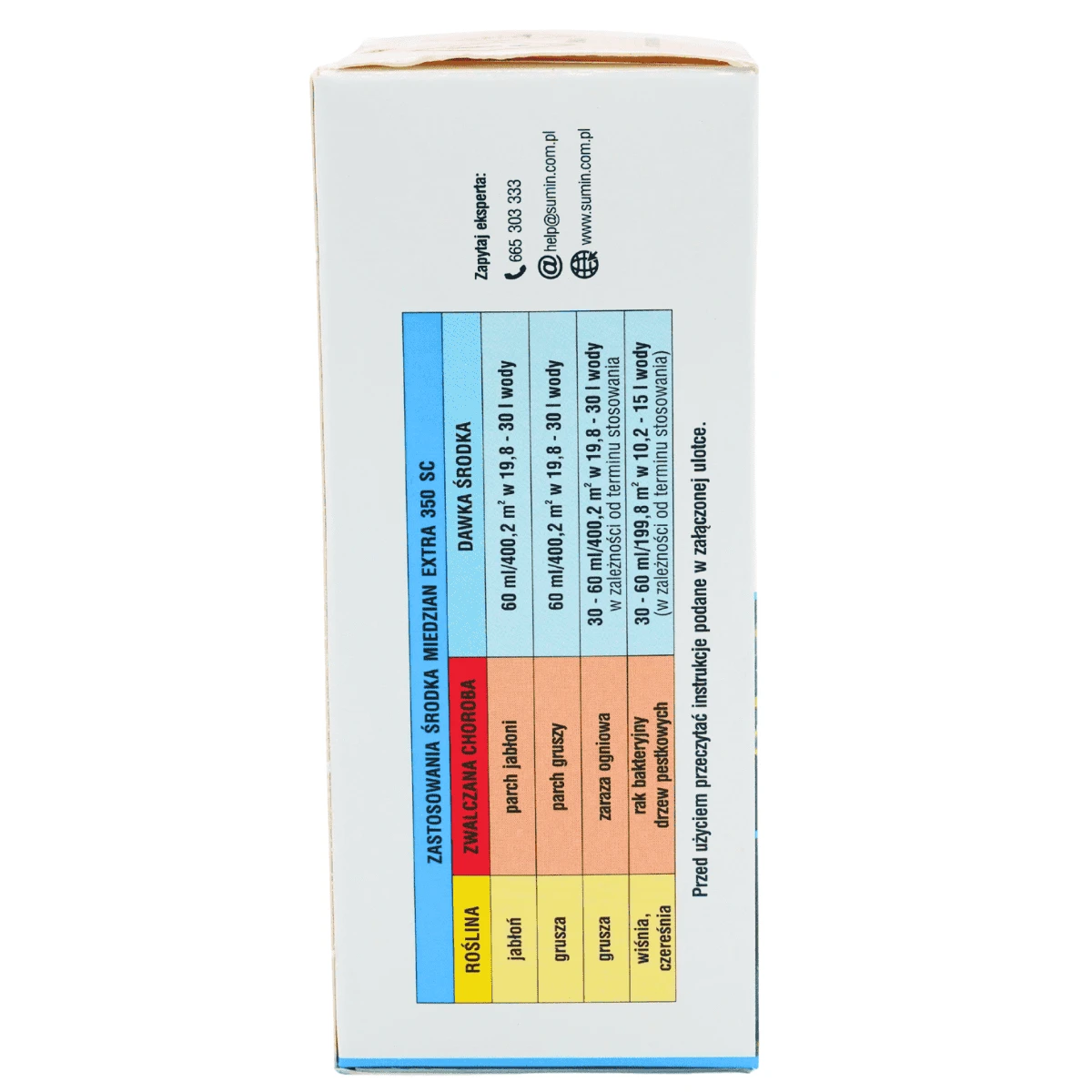 Miedzian Extra 350 SC to preparat o działaniu fungicydowym i bakteriobójczym, występujący w formie stężonej zawiesiny do rozcieńczania wodą (SC). Przeznaczony jest do zapobiegawczego zwalczania chorób grzybowych i bakteryjnych w uprawach sadowniczych. Działa powierzchniowo, tworząc na roślinach cienką warstwę ochronną, która skutecznie ogranicza ryzyko infekcji. Produkt dedykowany jest użytkownikom nieprofesjonalnym – do stosowania w sadach przydomowych, na działkach i w ogrodach.