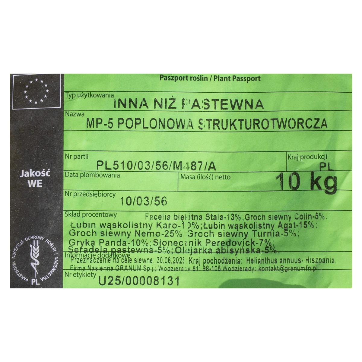 Mieszanka MP-5 to wielogatunkowy poplon strukturotwórczy o kompleksowym działaniu, który łączy w sobie zalety roślin bobowatych i innych gatunków roślin uprawnych. Jej regularne stosowanie w gospodarstwie pozytywnie wpływa na żyzność, strukturę i zdrowotność gleby, a także wspiera naturalną gospodarkę składnikami odżywczymi. To uniwersalne rozwiązanie, które sprzyja zarówno zwiększeniu plonów, jak i utrzymaniu dobrej kondycji stanowiska pod przyszłe uprawy.
