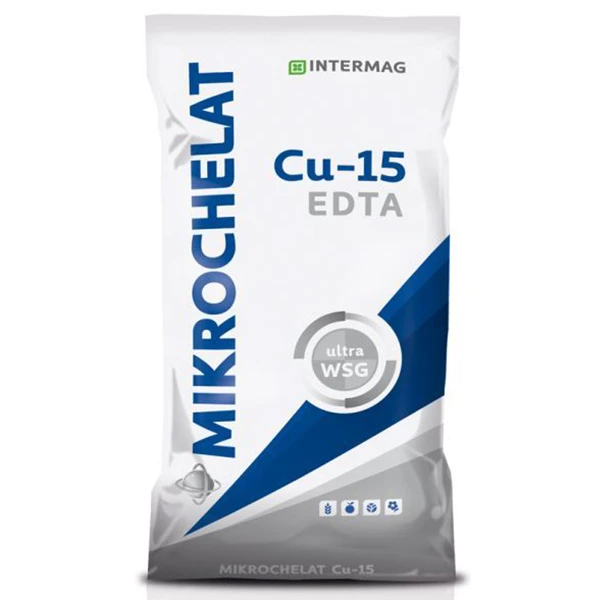 Mikrochelat Cu-15 zawiera 150 g/kg (15%) w pełni schelatowanej przez EDTA. Miedź (Cu) w formie chelatu jest szybciej wchłaniane, przemieszczane i przyswajane przez rośliny niż miedź dostarczana roślinom w innych formach. Nawóz korzystnie wpływa na wielkość i jakość plonu.