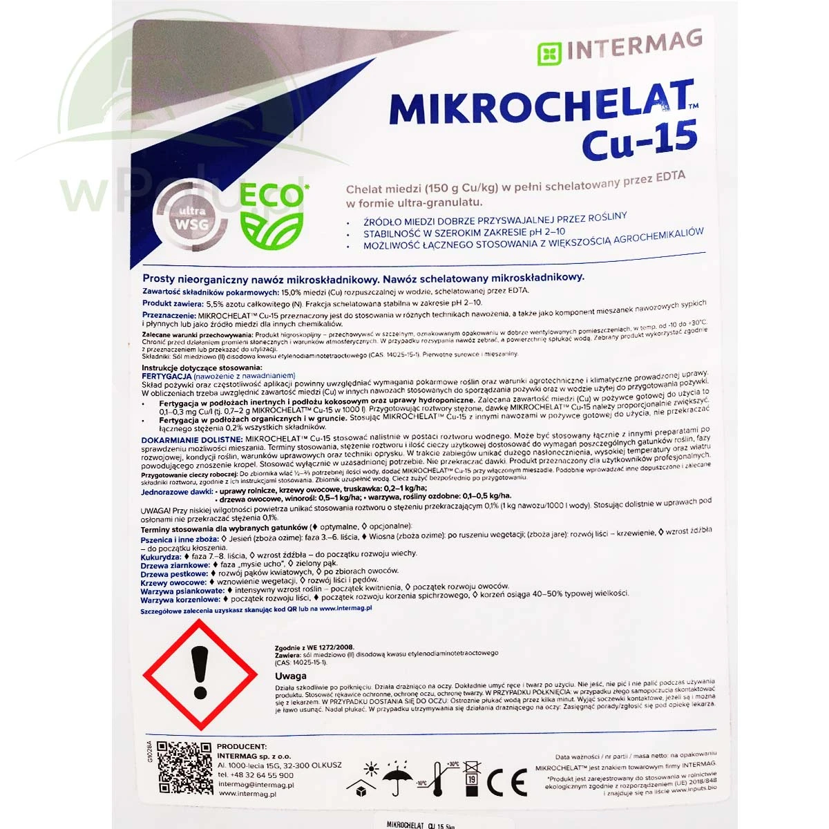 Mikrochelat Cu-15 stosowany profilaktycznie w uprawach roślin o wysokich wymaganiach w stosunku do miedzi (np. zboża, cebula, marchew, burak ćwikłowy, sałata, szpinak) – jest najefektywniejszym źródłem miedzi. Jest też niezbędny w przypadku występowania warunków glebowych ograniczających dostępność miedzi dla roślin (wysokie pH, wysoki współczynnik przepuszczalności, wysoka zawartość substancji organicznej, a szczególnie w uprawach na glebach użytkowanych rolniczo od niedawna i zasobnych w próchnicę – tzw. „choroba nowin”). Mikrochelat Cu-15 skutecznie zapobiega powstawaniu niedoboru miedzi w roślinach.