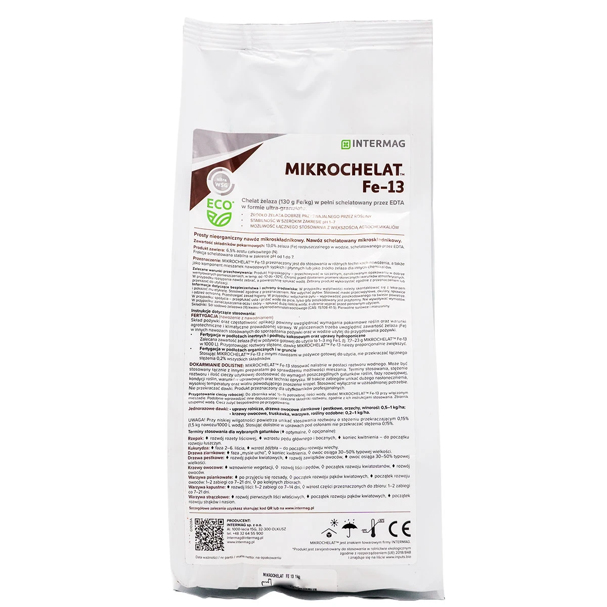 Mikrochelat Fe-13 zawiera 130 g/kg (13%) żelaza w pełni schelatowanego przez EDTA. Żelazo (Fe) w formie chelatu jest szybciej wchłaniane, przemieszczane i przyswajane przez rośliny niż żelazo dostarczane roślinom w innych formach. Nawóz korzystnie wpływa na wielkość i jakość plonu.