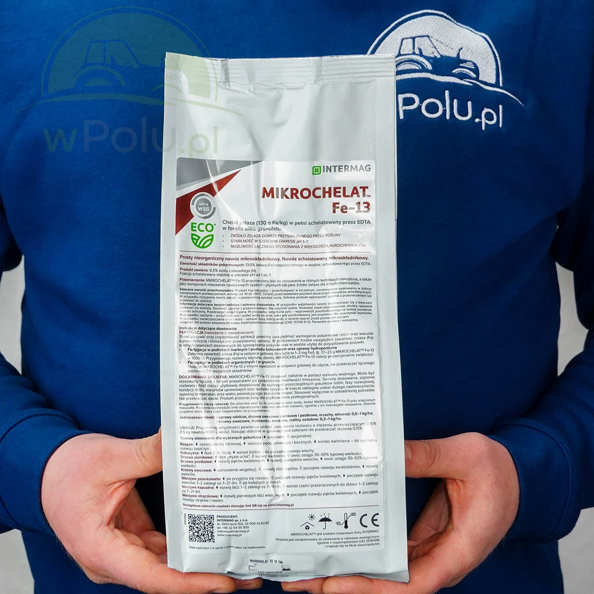Interwencyjnie – stosować MIKROCHELAT™ Fe-13 w przypadku gdy wystąpią wizualne objawy niedoboru żelaza na roślinach lub po zdiagnozowaniu zbyt niskiej zawartości tego składnika w roślinach, a także w przypadku zalania systemu korzeniowego.