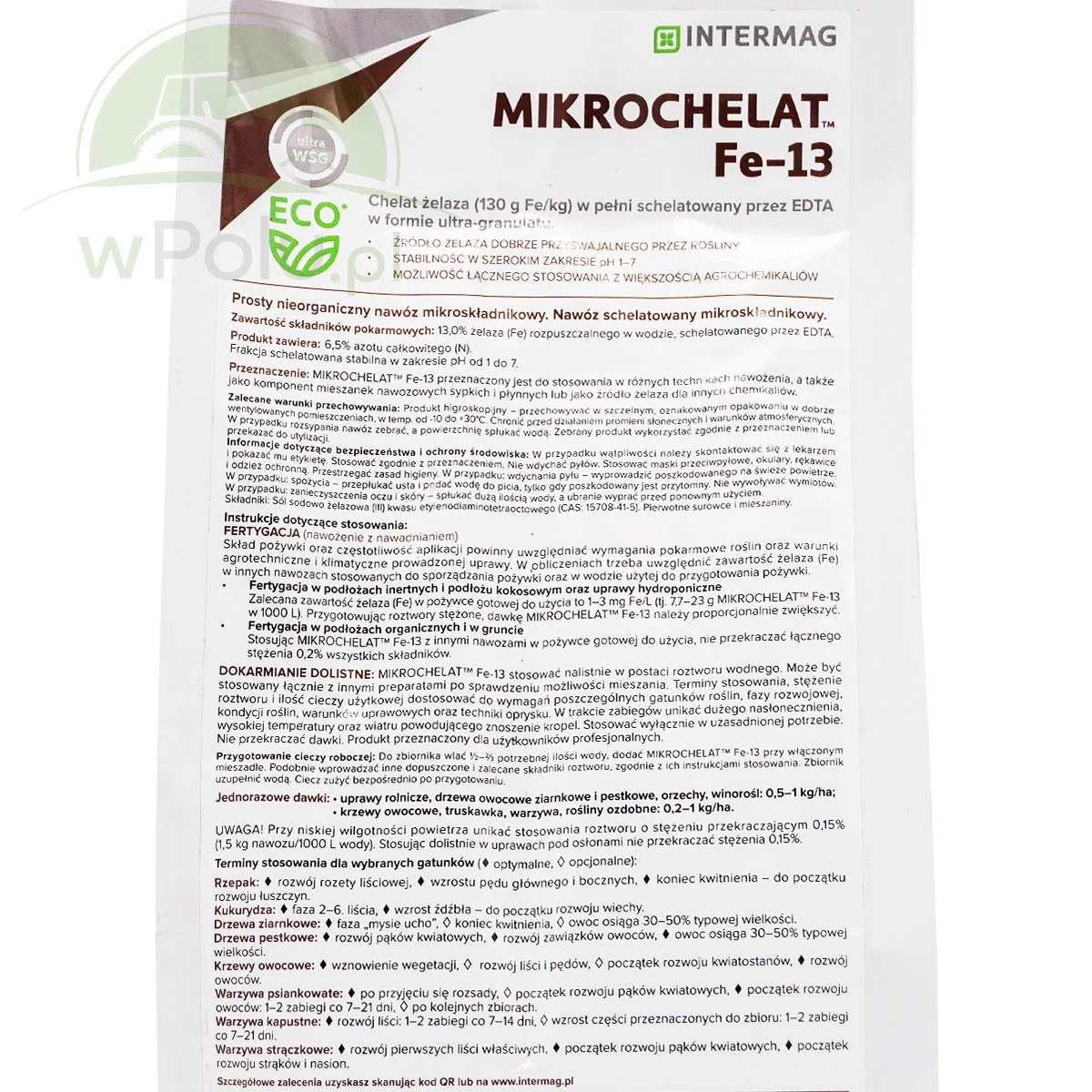 Mikrochelat Fe-13 stosowany profilaktycznie w uprawach roślin o wysokich wymaganiach w stosunku do żelaza (np. fasola, buraki, kapusty, brokuł, kalafior, szpinak, pomidor, papryka, truskawka, rośliny kwasolubne uprawiane na glebach o odczynie obojętnym lub zasadowym) – jest najefektywniejszym źródłem żelaza. Jest też niezbędny w przypadku występowania warunków glebowych ograniczających dostępność żelaza dla roślin (wysokie pH, wysoka zawartość manganu, brak tlenu w strefie korzeniowej). Skutecznie zapobiega powstawaniu niedoboru żelaza w roślinach.
