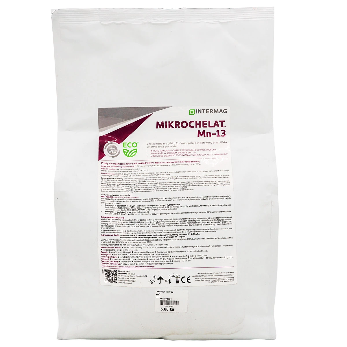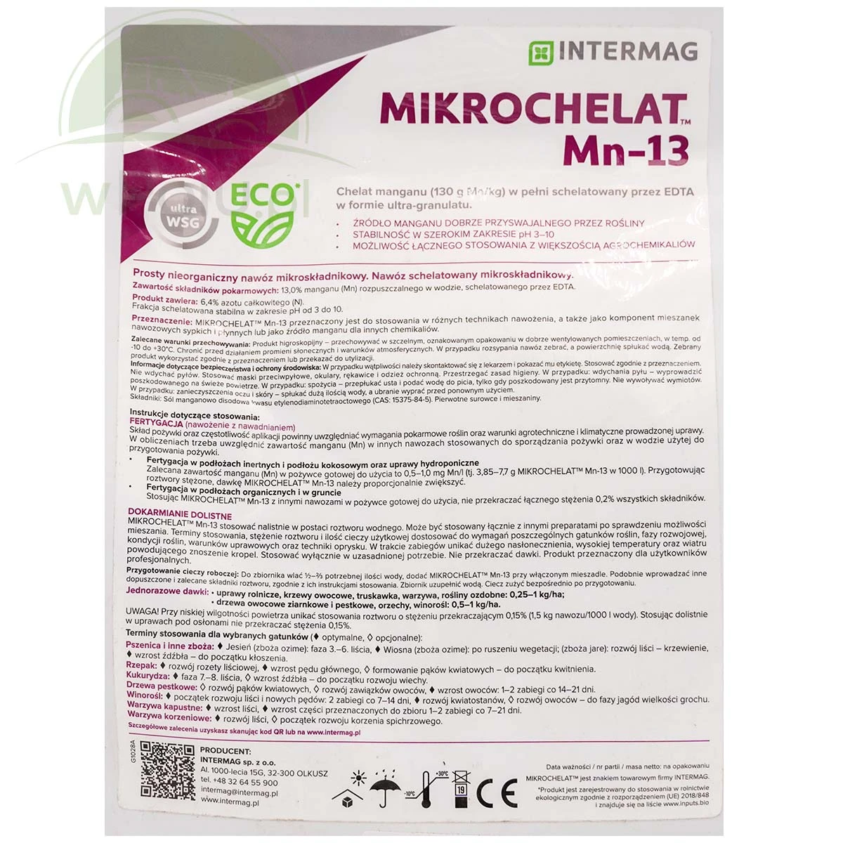 Mikrochelat Mn-13 stosowany profilaktycznie w uprawach roślin o wysokich wymaganiach w stosunku do manganu (np. zboża, rzepak, kukurydza, ziemniak, burak, jabłoń, wiśnia, śliwa, brzoskwinia, malina, groch, fasola, szpinak, kapusta) – jest najefektywniejszym źródłem manganu. Jest też niezbędny w przypadku występowania warunków glebowych ograniczających dostępność tego składnika dla roślin (wysokie pH, wysoka zawartość żelaza, brak tlenu w strefie korzeniowej). Skutecznie zapobiega powstawaniu niedoboru manganu w roślinach.