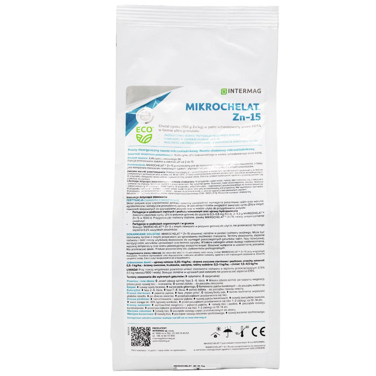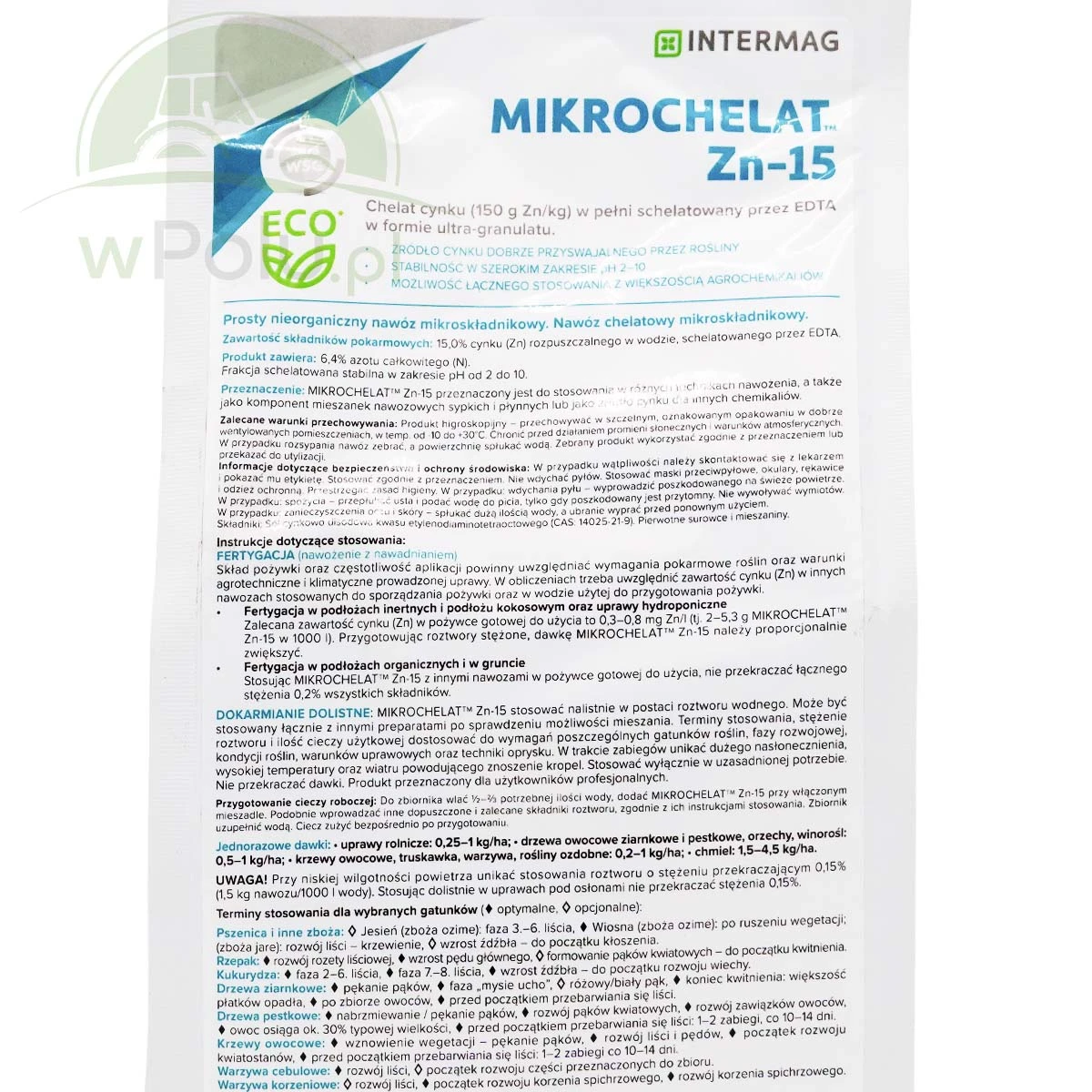 Mikrochelat Zn-15 zawiera 150 g/kg (15%) cynku w pełni schelatowane przez EDTA. Cynk (Zn) w formie chelatu jest szybciej wchłaniany, przemieszczane i przyswajane przez rośliny niż cynk dostarczane roślinom w innych formach. Nawóz korzystnie wpływa na wielkość i jakość plonu.