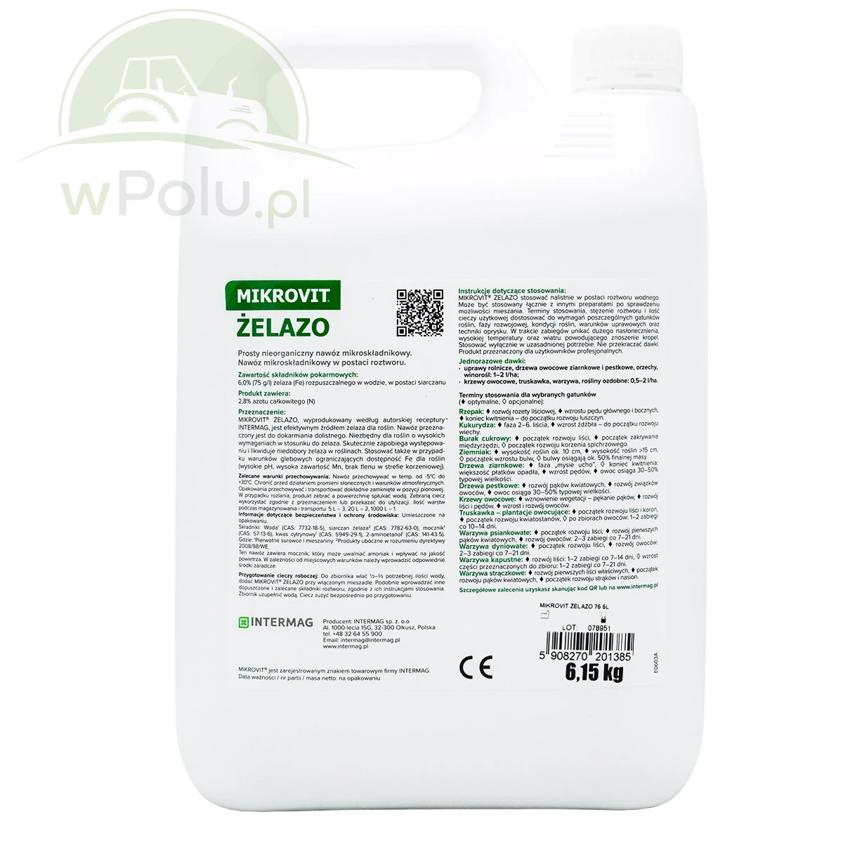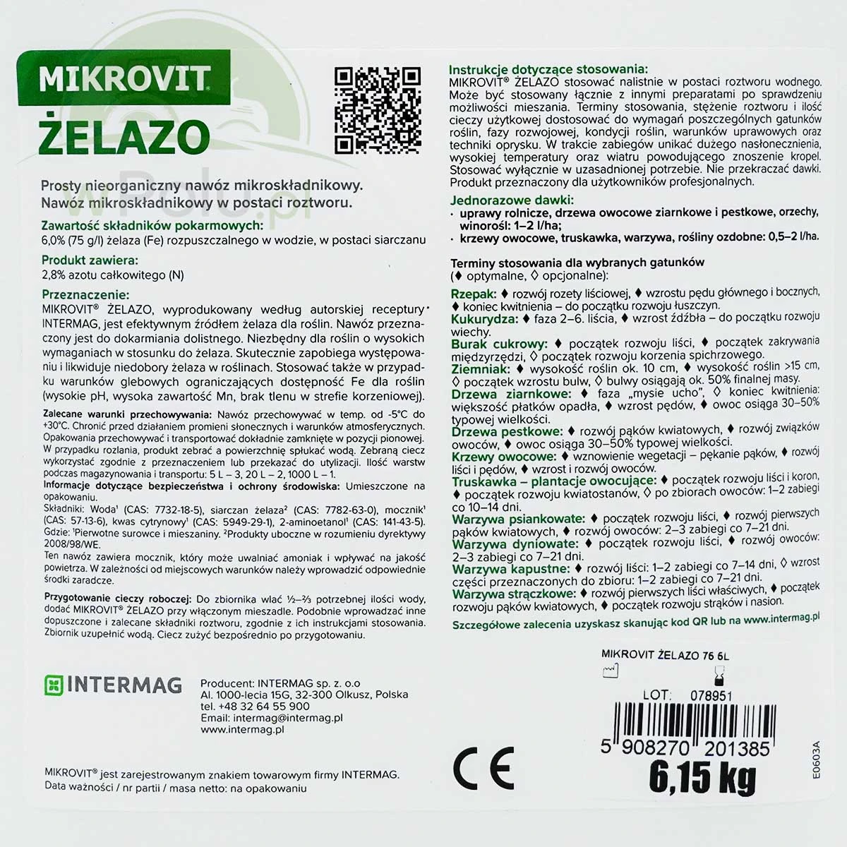 Płynny nawóz zawierający 75 g Fe w 1 litrze, przeznaczony do dolistnego stosowania. Dostarcza roślinom żelazo, które jest efektywnie pobierane i wykorzystywane przez rośliny. Mikrovit Żelazo zawiera związki kompleksujące, które przyspieszają pobieranie żelaza przez rośliny oraz ułatwiają łączne stosowanie nawozu z innymi agrochemikaliami. Nawóz korzystnie wpływa na wielkość i jakość plonu.